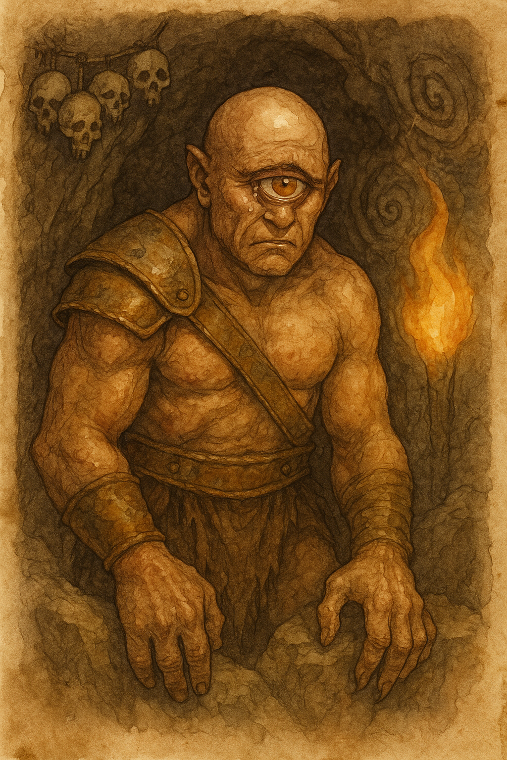 Zyklopen sind einäugige Riesen, deren einziges, großflächiges Auge mittig in der Stirn sitzt – bernsteinfarben oder grünlich schimmernd wie polierter Stein. Selbst wenn das Auge verdeckt ist, verraten sie sich durch ihre gewaltige Statur, sehnige Arme, schaufelgroße Hände und eine rohe Kraft, mit der sie Felsbrocken wie Kiesel heben. Ihr Ruf als Menschenhasser beruht auf alten Fehden um Weideland, Erzadern und Küstenhöhlen; viele Stämme greifen Eindringlinge ohne Warnung an. Es gibt jedoch zurückgezogen lebende Linien, die nur verteidigen, was sie als ihr Recht betrachten, und mit Hirten oder Grubensiedlern widerwillig Tauschhandel treiben.