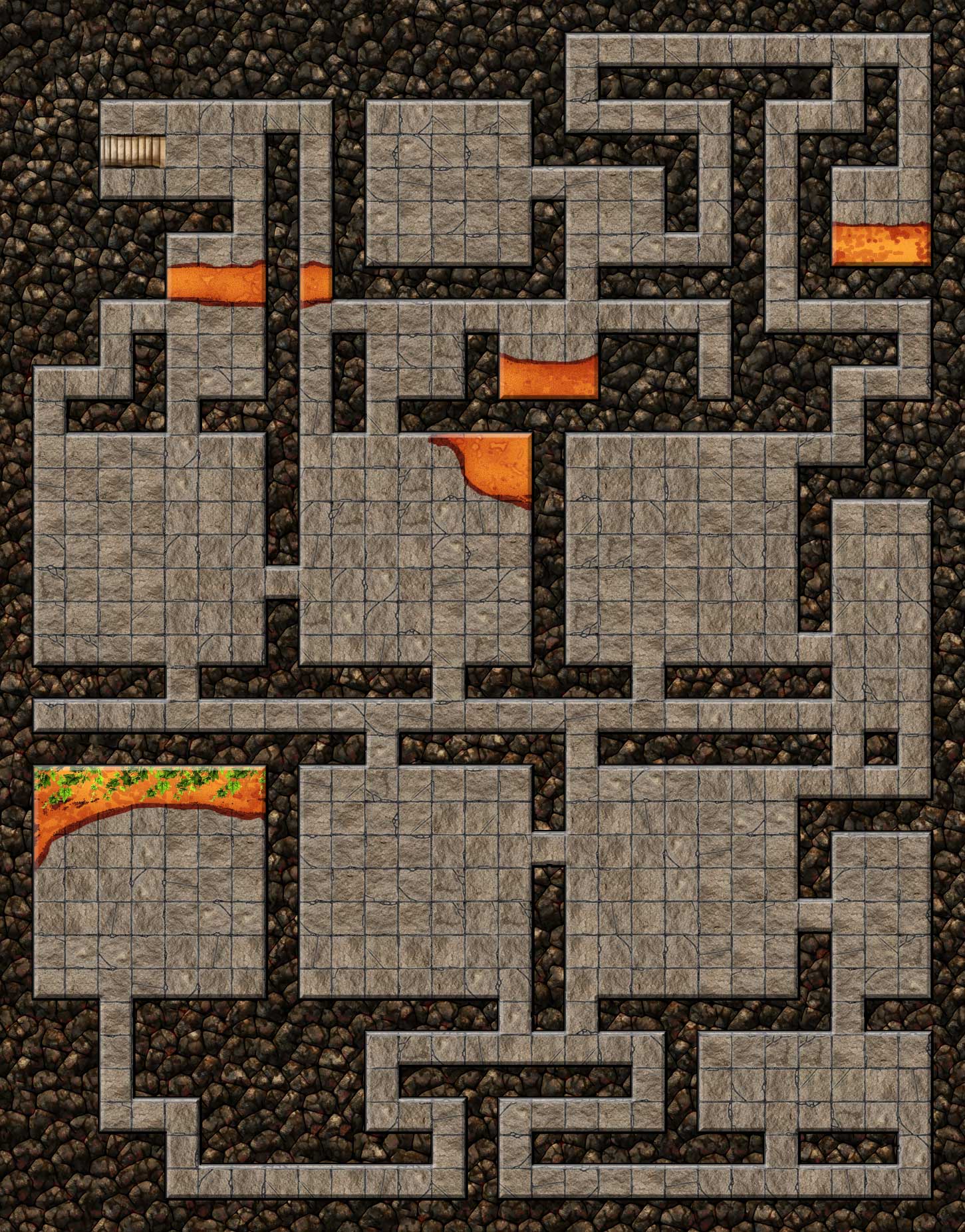 A dungeon complex with lava features, including walls dripping lava and lava rivers. Contains multiple rooms and corridors with various doors to explore.Spells