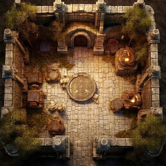 An open courtyard where the aerial battle takes place, containing magical circles that were later scratched out by the party.Mysterious House