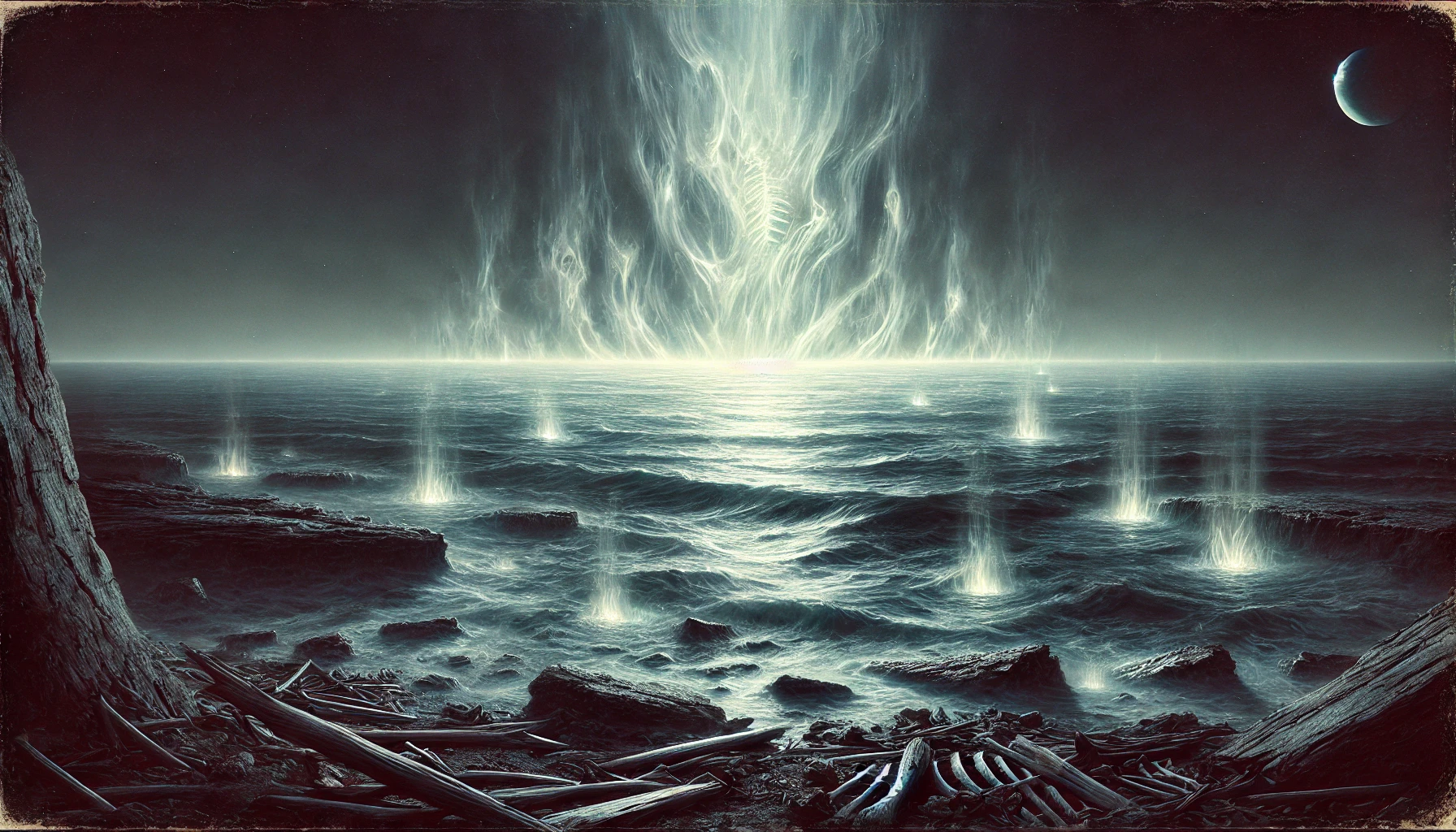 Hypnotic Allure: Many who gaze upon the Bonelight feel an inexplicable pull toward it, as though entranced. This often leads to disorientation, risky decisions, or even a compulsion to walk into the water or steer their ships toward the glow. Emotional Turmoil: The pale glow evokes a sense of unease, sadness, or even dread, as if the light carries echoes of the divine battle or the suffering of the souls lost to the sea. Auditory Hallucinations: Some claim to hear faint whispers, cries, or chants when near the Bonelight. These sounds may take the form of long-dead voices or unintelligible murmurs that linger in the mind. Paranoia And Madness: Prolonged exposure to the Bonelight can cause paranoia, nightmares, or vivid hallucinations, as if the light is imprinting ancient memories of the battle onto the minds of the living.Effects On Those Who Encounter It Directly