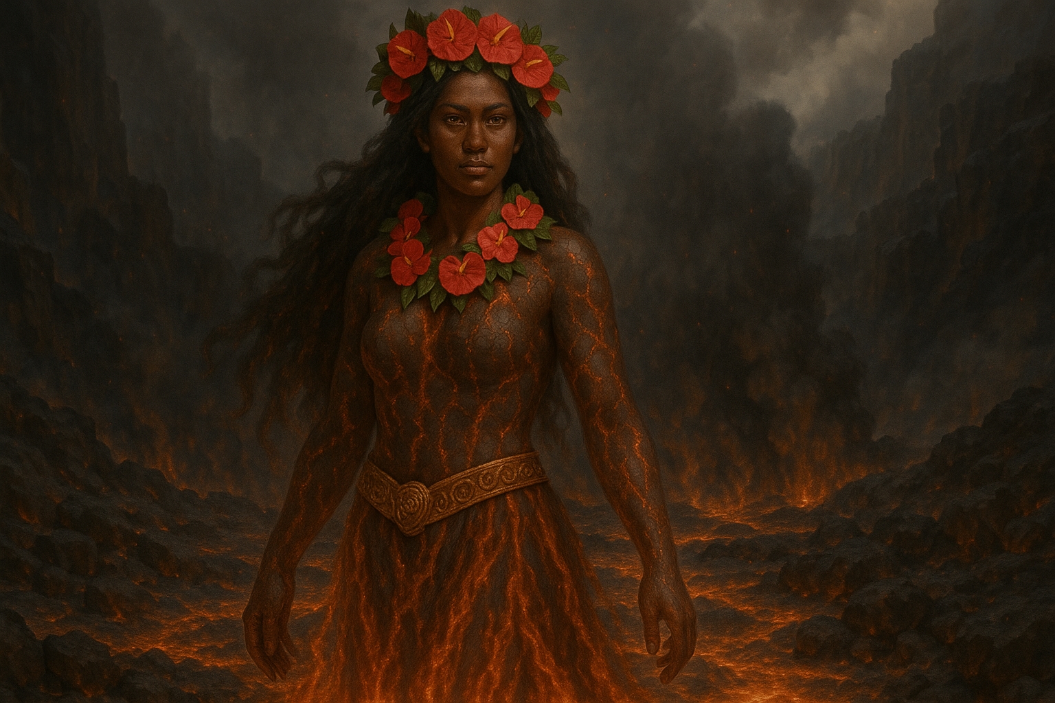 Her hands, wreathed in flickering flame, can either nurture fire gently, forging new life, or become claws of destruction, burning through anything she touches. With each step she takes, the ground beneath her scorches, cools, and then cracks, unable to withstand the raw force of her presence for long.