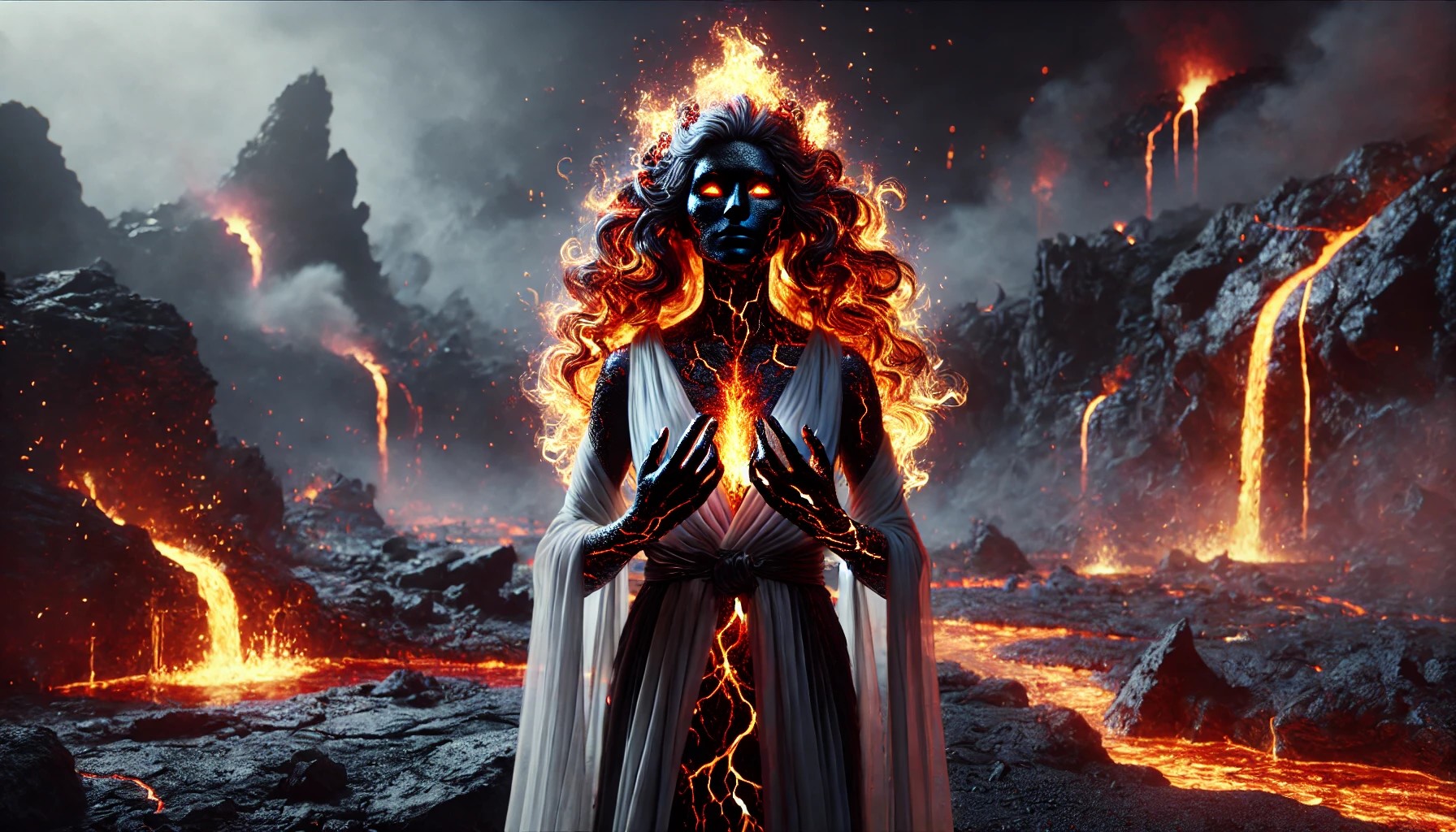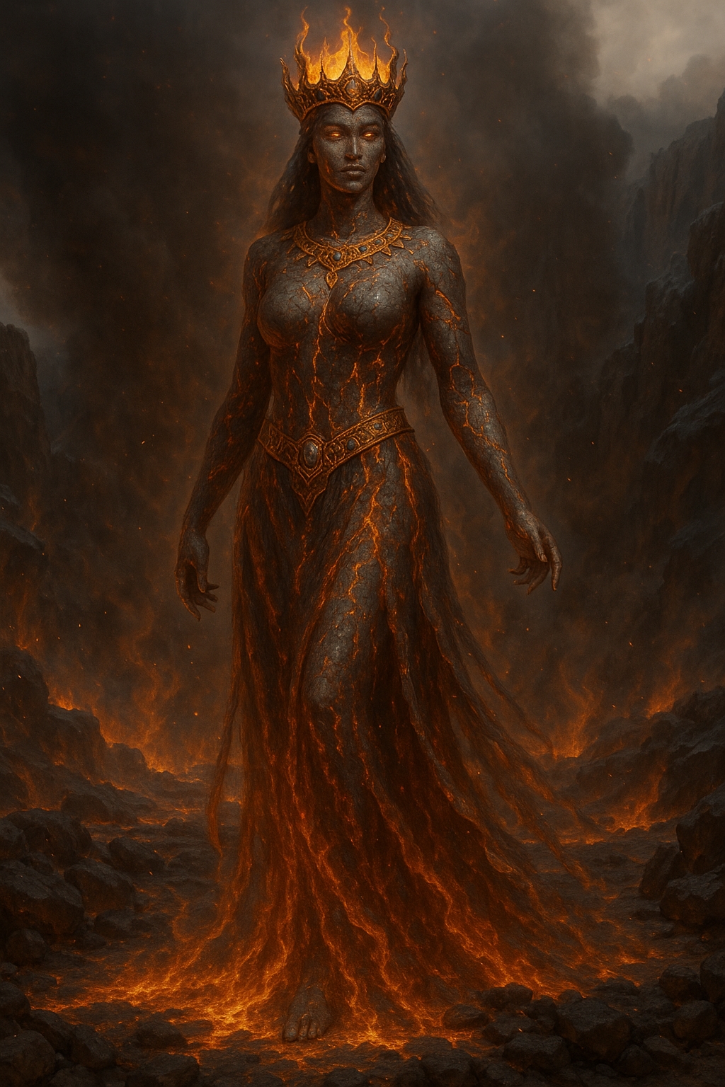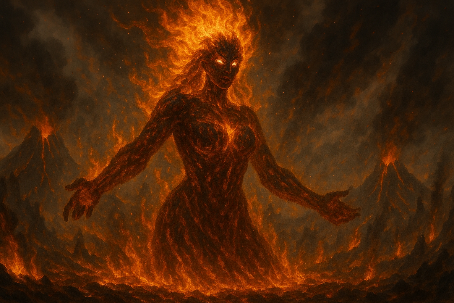 Her eyes blaze like twin miniature suns, radiating intense heat capable of melting stone or setting wood ablaze with a single glance. Her lips, also glowing with molten intensity, leave trails of fire in the air when she speaks. She often wears minimal clothing, either a flowing robe of smoke and ash, or an ever-shifting dress woven from flame and volcanic rock. Some depictions show her wearing jewelry forged from hardened lava, with rings that burn as hot as the heart of a mountain.