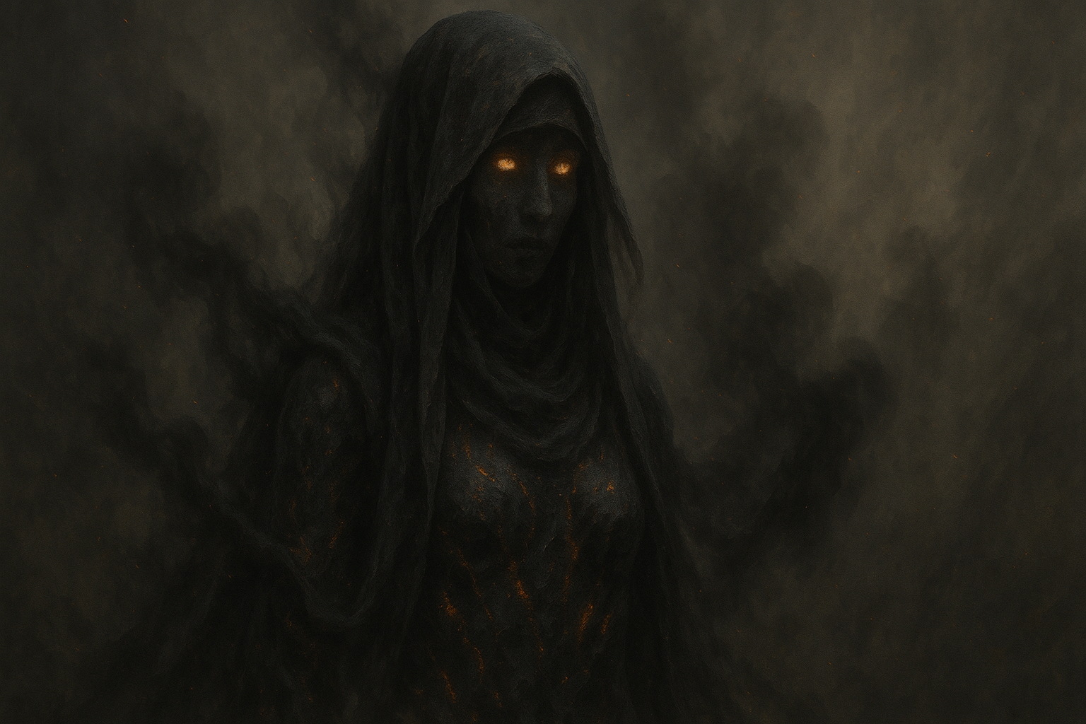 The Smoldering Watcher: At times, Vulca manifests in a more subtle and mysterious form, particularly when appearing to mortals in visions or as an omen. In this form, she is a veiled woman wrapped in shadow and smoke, her body seemingly made of cooling volcanic glass, with flickers of fire visible beneath the surface. Her eyes glow softly like embers, and wherever she walks, ashes drift in the air.