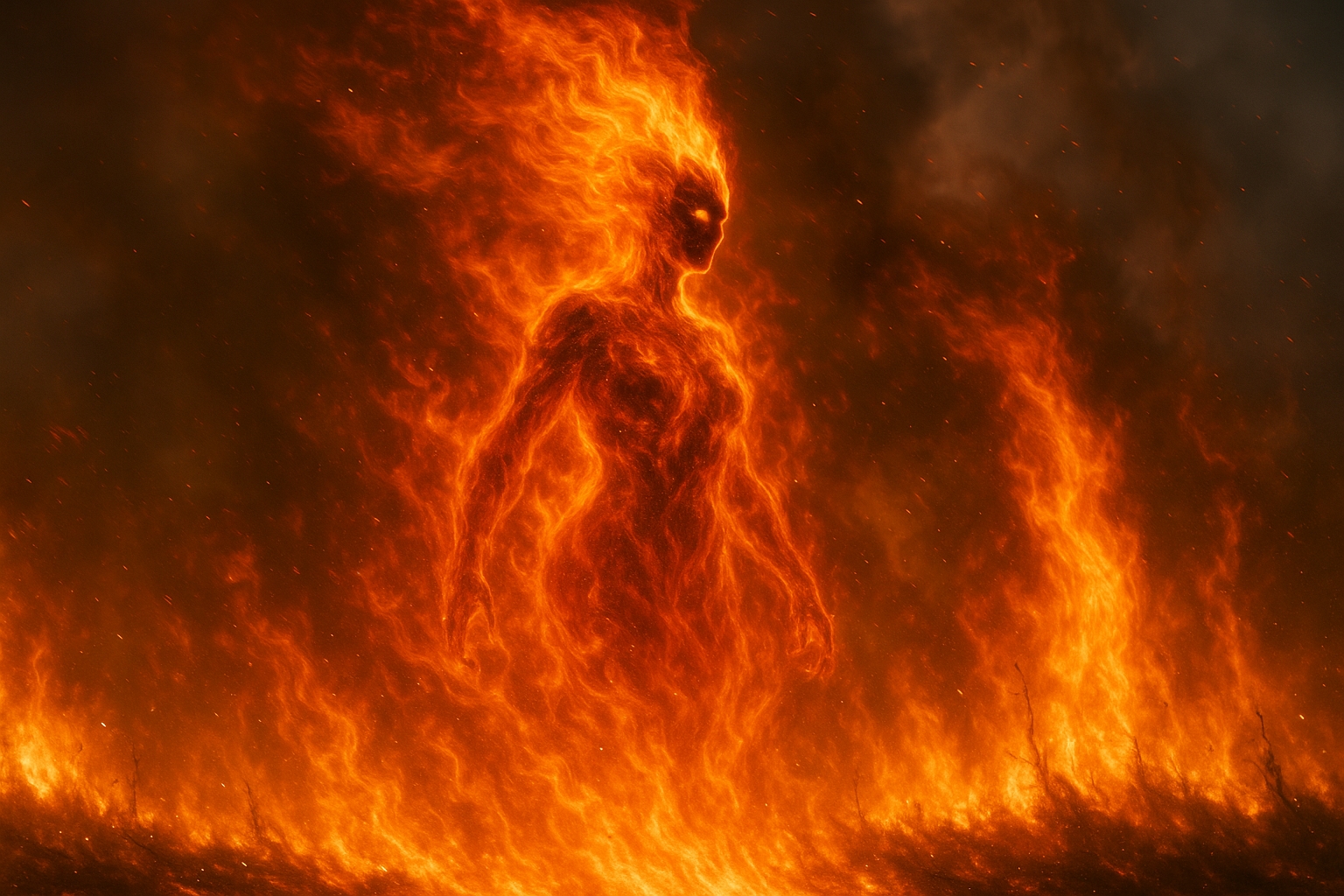 The Living Inferno: At her most primal, Vulca sheds all material form and becomes a sentient, raging wildfire, an ever-burning, ever-consuming force of pure energy and destruction. In this state, she is seen only as a massive swirling inferno, shifting between towering firestorms and a humanoid silhouette wreathed in flame. This is the form in which she is most uncontrollable, a storm of fire given will, raging across the land with no care for what stands in its path.