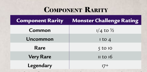 Components and Workshops have a rarity, which correspond to the rarity of the magic item made with them. For exam ple, an Uncommon magic item typically calls for Uncommon Components and must be created at an Uncommon workshop. T his rarity also provides a rough gauge for what level characters should be able to craft the item. T he rarity of harvested Components are based on the mon ster’s Challenge Rating. Unless otherwise specified, a compo nent’s rarity is defined by the Component Rarity table.