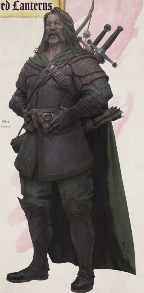 The leader of the Hooded Lanterns is Lord Commander Elias Drexel. He is a large, gruff man in his early fifties. He is well-built and imposing, with a grim frown on his wide, angular face. His harsh features are framed with a thick mustache, side chops, and a mane of long braided brown hair. He is often garbed in chainmail with heavy leather gloves and boots, worn under a fur-lined dark green cloak and iron pauldrons, upon which is firmly clasped the Lord Commander’s Badge.