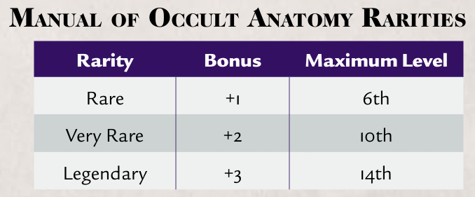 In addition, the book contains the knowledge of an Apothecary Esoteric Theory or Warlock Eldritch Invocation up to a level determined by the manual’s rarity and chosen when the item is created, which you gain while you are attuned to it. This determines which class is required to attune to the item.
