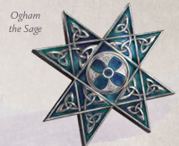 Some speculate the first warlock pacts were made to Ogham, who granted them otherworldly powers of the cosmos. As the keeper of all secrets and god of knowledge, Ogham is depicted as a wizened man with a third eye on his forehead and an endless beard, woven with clay braids counting every event that has ever occurred. Alternatively, he is thought to be a floating eye soaring through space with swirling motes of energy surrounding his alien form, observing all of existence, time, and space at once. Ogham is also sometimes depicted as a hybrid human-owl creature carrying a stack of stone tablets said to contain the ultimate truth of all things.
