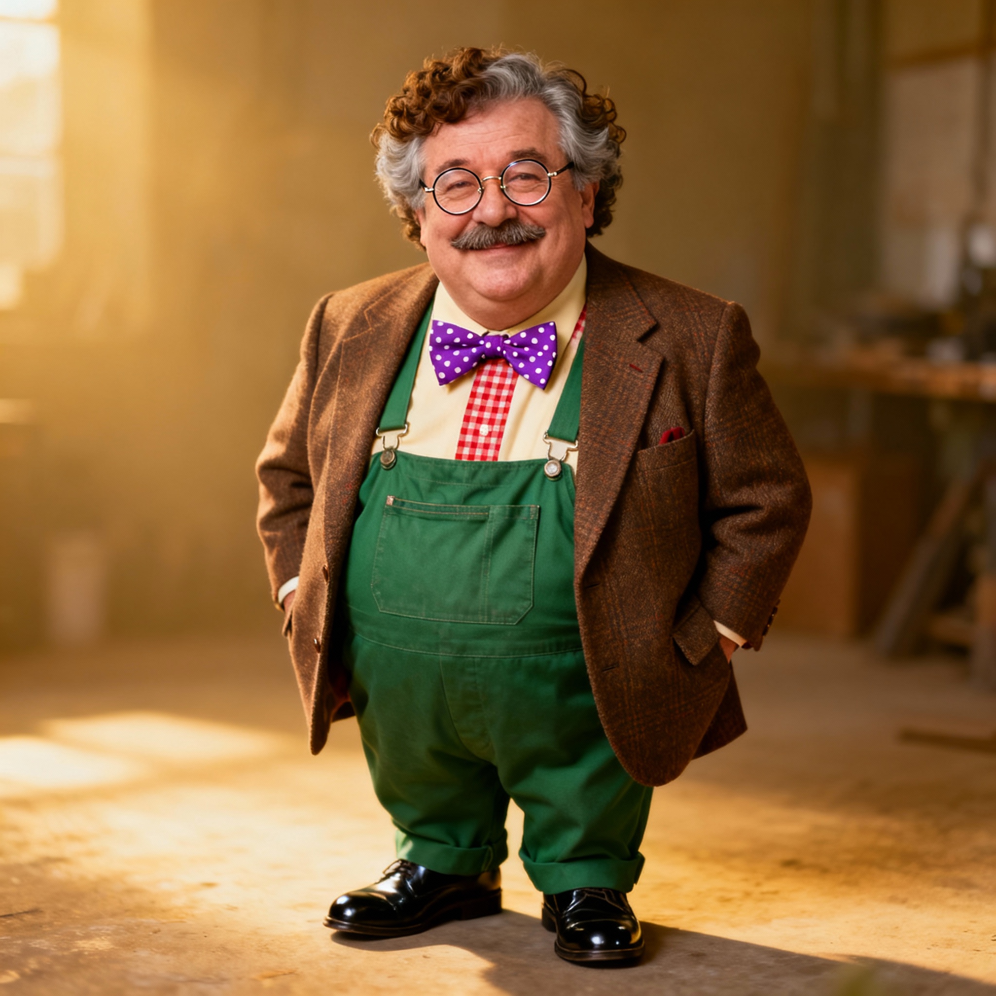 He is a quaint rotund fellow with curly brown and grey hair and mustache, about 5'4" and wears professional green overalls, a brown tweed jacket, cream-color shirt with red checkered pattern, and polished black shoes. His ensemble is accented by a lavender polka dotted bow-tie and perfectly circular bifocals. After years as a successful adventurer, he assumed the role of the professor for various classes in the Arts and Humanities Departments. He is well-known for his eccentricity and friendly behavior.