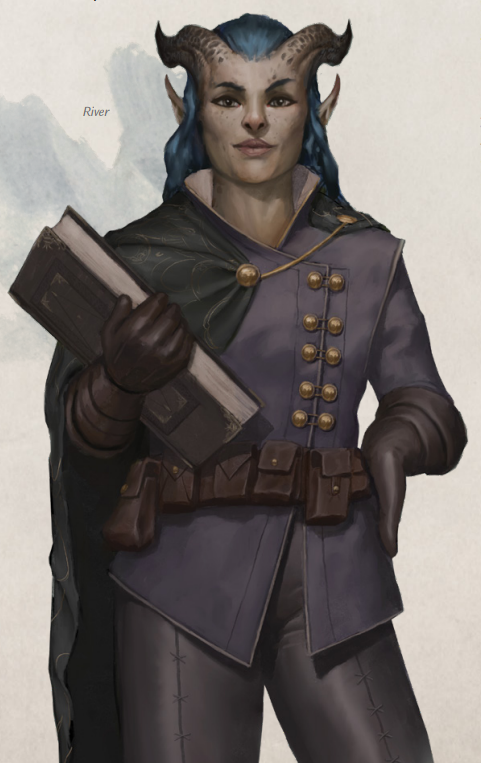 River is a tiefling mage. She is a short woman in her late twenties. Her attire is practical and professional, a hip-length purple jacket with a high collar, and belted at her waist are several pouches and pockets. She wears five rings on her right hand. Two oddly-shaped dark brown horns sprout backwards from her flowing blue hair, creating the impression of two boats at sea. River has spotted brown skin and impish features: her teeth are too sharp, her tongue too long, and it’s slightly unsettling when she smiles.