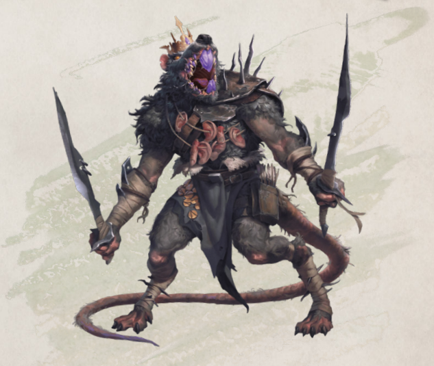 The ratlings in the burrow are led by a large and ferocious ratling who self-styles himself as the Rat Prince (see Appendix A). He rules because he’s the biggest, strongest, and killed the last ratling who called themselves the Rat Prince. He believes once his colony has enough food, they will be able to grow large and multiply. Then all the other ratlings will bow down to him for sure!