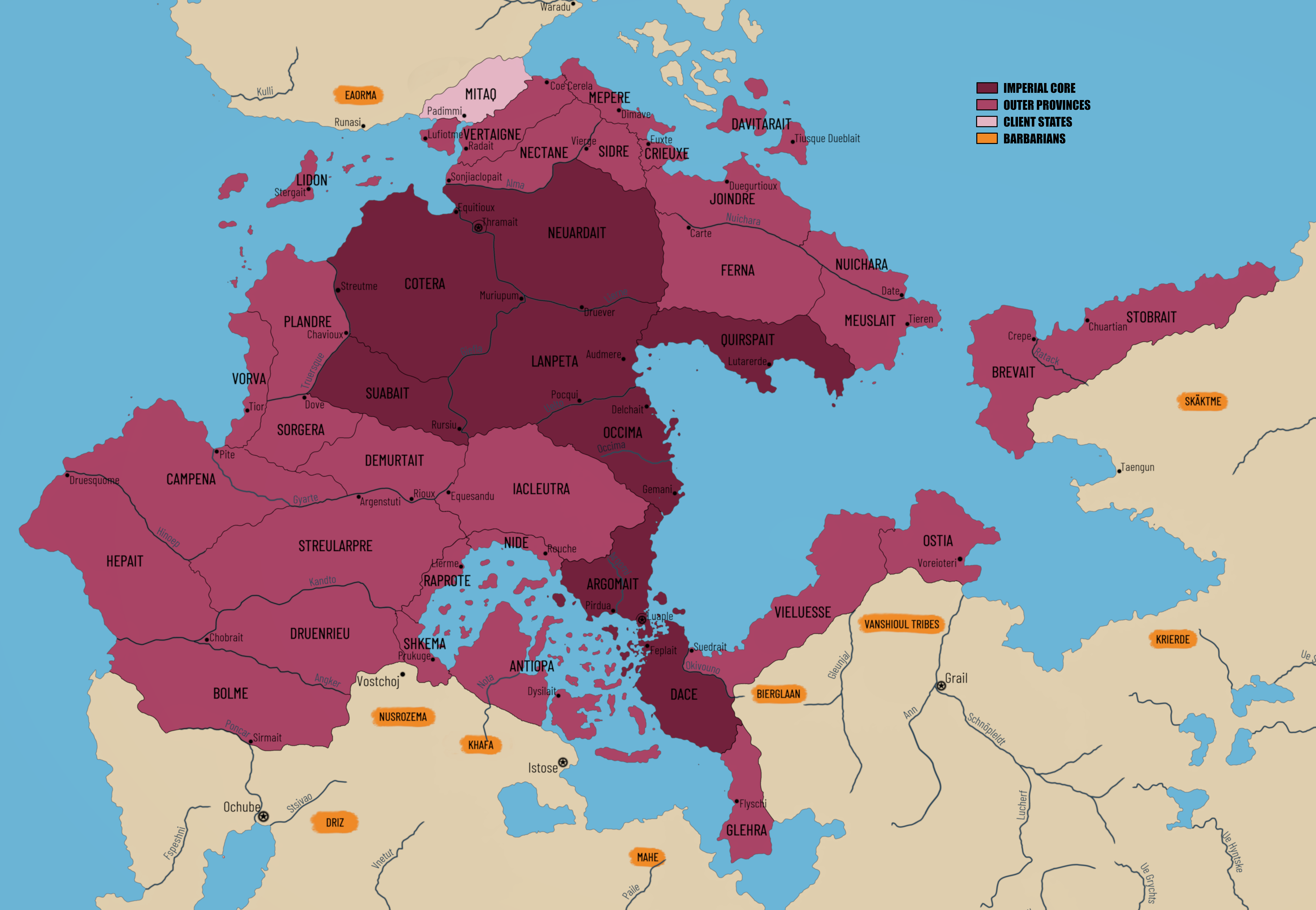 Originally a small state on the northwestern coast of what is now Jideran, the Jiderani Empire spread across much of the continent. While it was given the name "Jiderani Empire" by historians, its contemporaries simply called it Jideran. It expanded across northern Jideran and western Vieluesse, at its peak controlling territory from the Velnu Land Bridge in the north, to the Stichzes and Tsizikh Mountains in the south, and to the Svielzahn Mountains in the east. It even controlled part of the region now known as Brevia on the Fjodthi Subcontinent of Vieluesse.