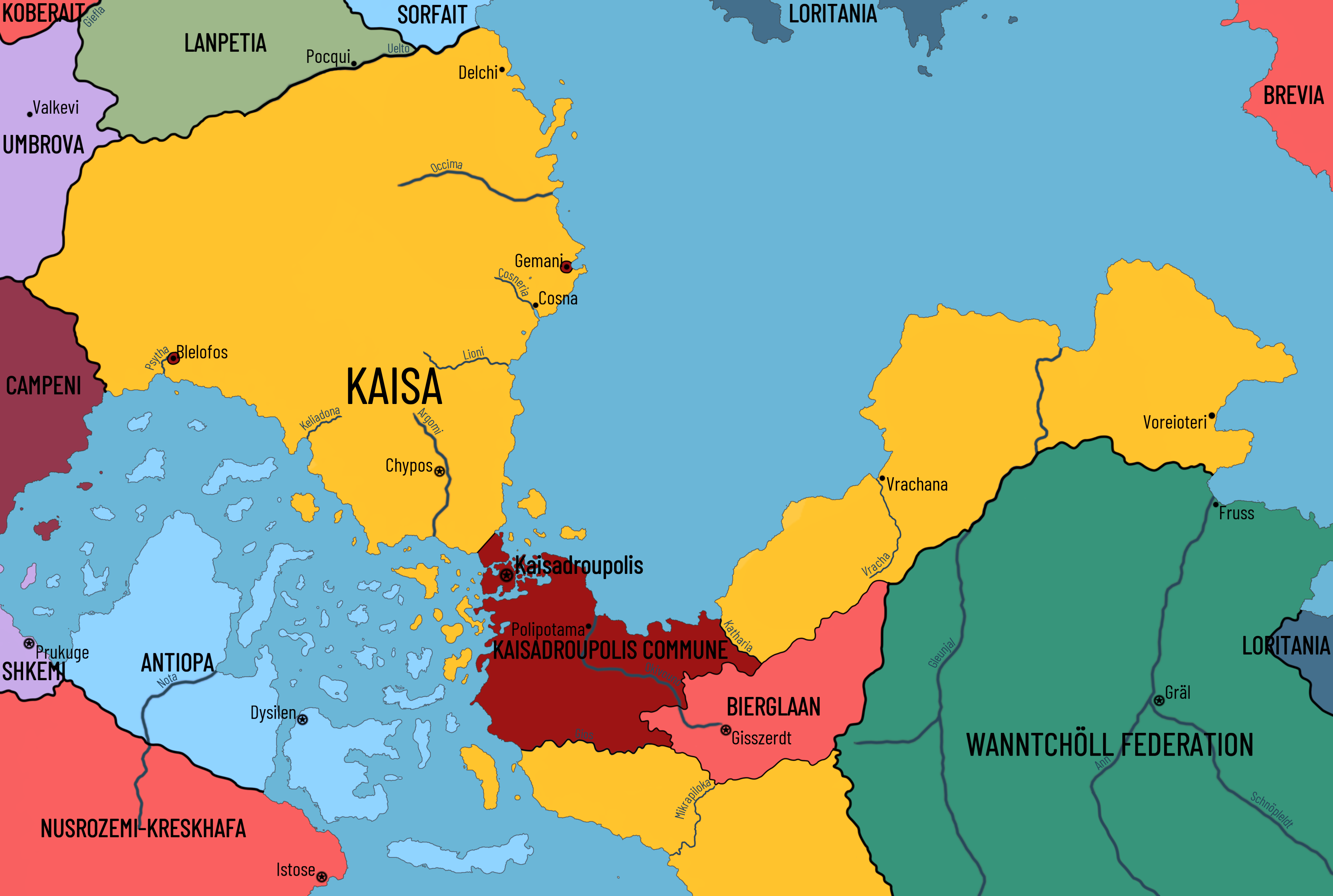 Economic recession following the Red Week exacerbated mass public unrest in Kaisa. The Kaisan Symvouli Tiporé was already broadly unpopular with the workers and peasants, who were voiceless within the political system of the country. When the Symvouli began to impose austerity measures that they claimed were to stabilize the crumbling economy, a general strike was called in Kaisadroupolis by the SEK. The Symvouli sent in the Etnofroura to break the strike, and eleven striking workers were killed and hundreds more injured. Rather than ending the strike, this enraged the workers, who began fighting back in earnest. The strike spread across south-central Kaisa and even into a few cities in the northwest. In Kaisadroupolis, many of the wealthy property owners and aristocrats of the city began to flee, fearing the worst. The revolution is generally considered to have begun when the action committees in Kaisadroupolis called for the communization of the homes and property of all bourgeouis and aristocrats who fled the city. At around the same time, the people of Bierglaan, an autonomous administrative region within the Svielzahn Mountains of eastern Kaisa, began to revolt. They drove the Gisszerdt garrison out of the city and declared their independence from Kaisa. With Kaisadroupolis and the surrounding region in full revolt, the Symvouli ordered their forces to pull back from the city and lay siege to the newly-declared Kaisadroupolis Commune while they prepared an offensive. They fell back to the Gios River in the south, the Katharia River in the northeast, and the base of the Gafinou Peninsula in the northwest. Within the commune, a defense force was raised. Hastily put-together workers militias and a few units of soldiers that threw their lot in with the commune came prepared for a fight. For a time, it seemed like the revolution would spread and burn Kaisa from within, but while the revolution found ready kindling in Kaisadroupolis, it was not able to spread beyond a few cities in the west. Blelofos and Gemani both formed short-lived communes of their own, but the revolutionary movement failed to spread to other cities or to the countryside. In 1334, the Symvouli declared the adoption of a number of liberal reforms, including the creation of a popularly-elected legislative body and minor protections for workers. In return, the moderate unions declared an end to the strike. Even within these unions, plenty of workers refused to stand down, but the wind was taken from their sails. By spring of 1334, the communes in Blelofos and Gemani were dissolved. The Kaisadroupolis Commune, the center of the libertarian, federalist, and socialist union movements, survived and fought, but without allies and encircled by the enemy, it was an impossible war of attrition. In the Month of Water of 1335, a massive counteroffensive from the northwest recaptured Kaisadroupolis and pushed the revolutionaries up the Okivouno River and into the mountains. Many of the die-hard revolutionaries, particularly those who aligned with the libertarians and trade unionists, fled to the Bierglaan where they played a pivotal role in maintaining the Biergs' independence. Many revolutionaries in northwestern Kaisa who were at risk of arrest or execution fled to Campeni, where they played a part in the coming Prostian Revolution.