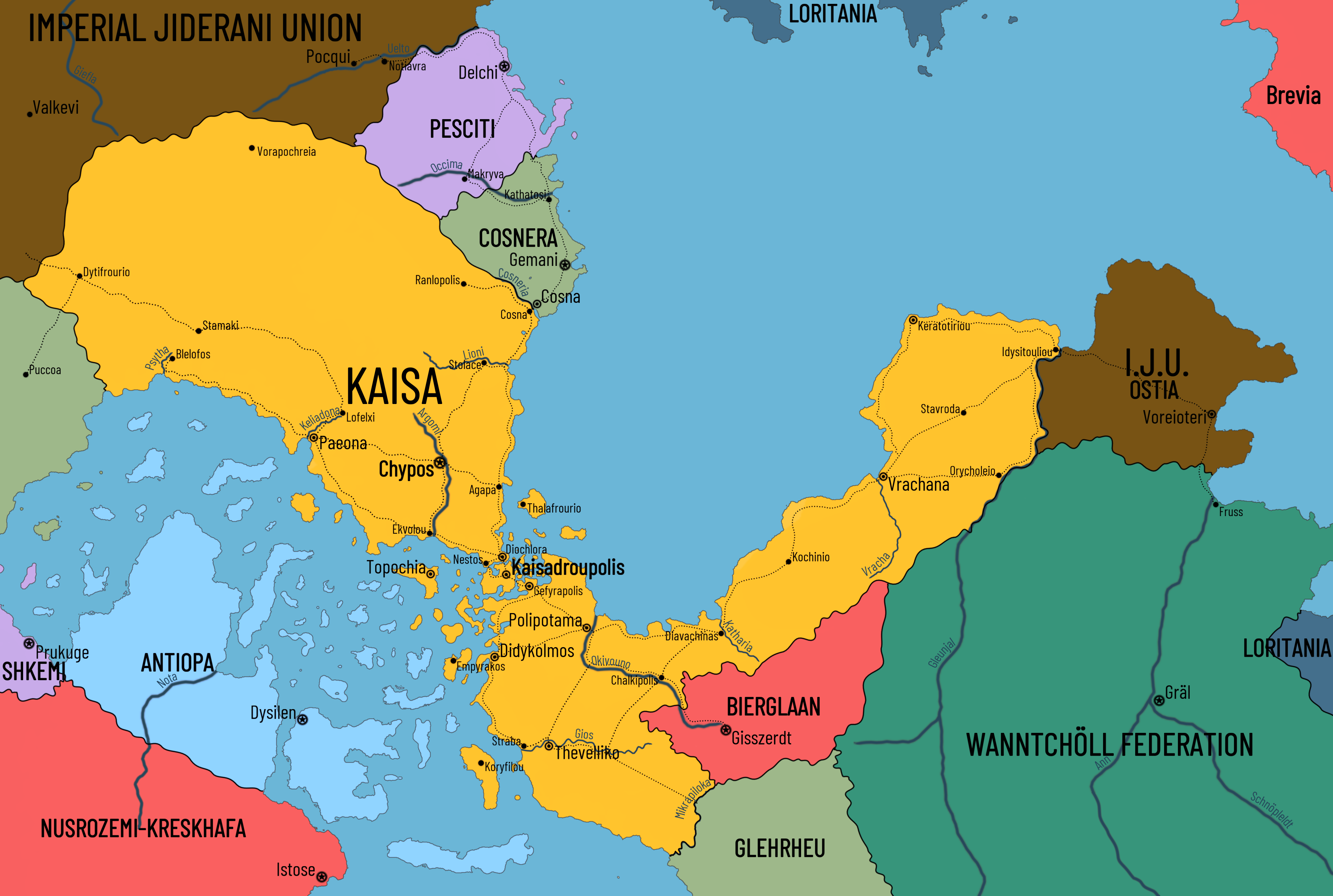 The Republic of Kaisa is an authoritarian republic on the Gafinou Peninsula, between eastern Jideran and western Vieluesse. With its overseas colonies of Kaisan Eaorma and Kaisan Kriehehrdtia, it is one of the largest nations of Duurn by territory, even after the loss of a significant portion of that territory following the Last War. For a long time, Kaisa was seen as a major world power, with an enormous amount of economic and cultural power backed up by one of the strongest militaries across Duurn.