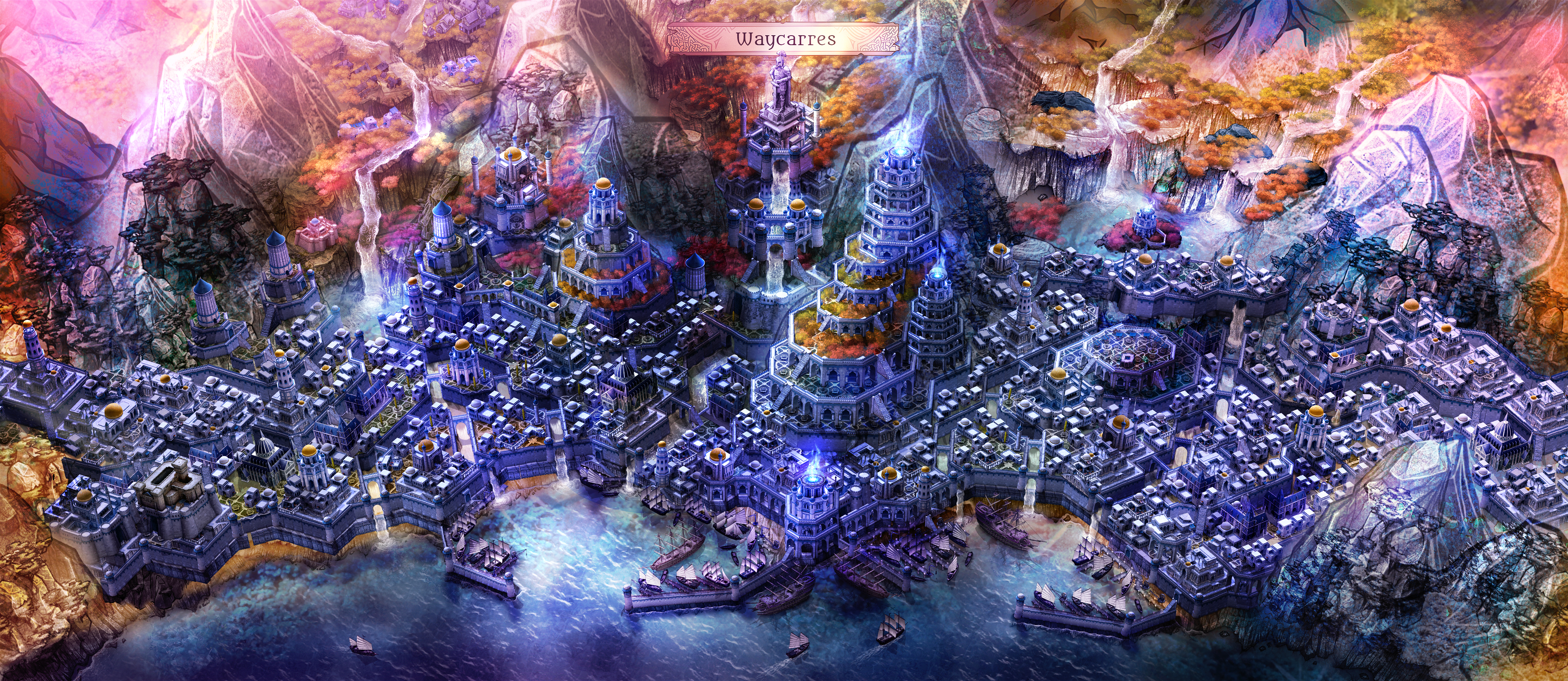 The gentle glow of mystic lights from Waycarres reflect off the polished stone bricks of the city, beckoning to any ship making its journey across the Sea of Dawn. Waycarres is poised on the coast, only a few hours' travels from the Valley of Life. The city is home base to the Xoriats, the four plutocrat-oligarchs that hold control of nearly all trade routes in Westwind, Evergloom, and much of Ember Forest. Waycarres is a trade hub for nearly any good or service one can think of, and those wealthy enough to call Waycarres home typically enjoy a variety of privileges and the finer things in life. For those less fortunate, there is always employment to be found along the docks or among the well-to-do citizens, even though that often means indentured servitude or an unpleasant home in and around the sewer systems that run beneath the streets and out about the bay. In the small district where these blue-collar workers collide with the mercantile middle-class, opportunities abound for performers, adventurers, and those of more taboo trades.
