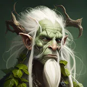 Êlgista's shimmering green body is surrounded by roots, tendrils, flowers and leaves. In her hand she holds a long, gnarled, barkless stick with crystalline emerald green leaves at the top. As soon as the rod touches the earth, roots sprout either deep or upward. She wears a crown of tendrils on her head. The tendrils are flexible, grow in all directions and can be dangerous to some who get too close to Elgista.