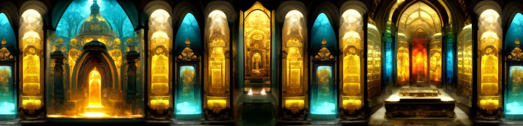 From the large main hall two stairs lead into the crypt to the tomb of Saint Eqilateus of Vinduria. The crypt is flooded with light, with the glass mosaics representing the four elements. The grave is decorated with gold and precious stones.