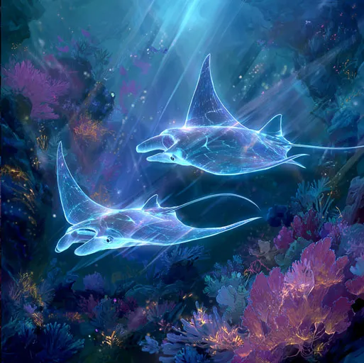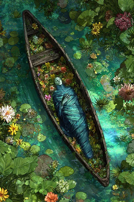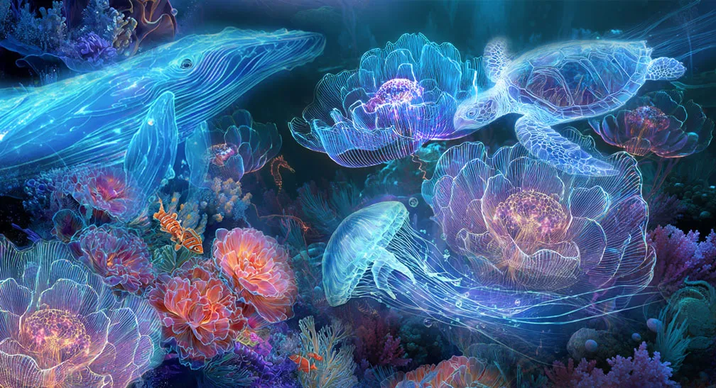 Luhu Dropclear drew a sign of gratitude in the sand with her tail. The scent of blooming plumeria, mingling with the light salt of the lapping waves, caressed her nose as she watched Oríl, the last chieftain of the Qiriri of the Emerald Lagoon, being laid in the ancestral barge. Soft, deep humming sounds reached her dragon ear, meant to soothe the grief of the bereaved, but Luhu had been too attached to the old chieftain, and tears of sorrow filled her deep blue eyes. Two manatees were tied to the front of the festively decorated boat, and the procession slowly began to move. Luhu joined the last of the boats, in which the entire village had taken their places. Songs of creation drifted over the mourners until everyone had reached the ancestral sandbanks. Enveloped in a dark blue lotus leaf and entwined with a woven net of water reeds, the chief was lowered into the water. Luhu dove down into the ancestral reef, which itself had specially adorned for the occasion. Luhu observed small coral sailfish hiding among the flowering polyps. More and more Qiriri followed Luhu underwater and surrounded the old chief's final resting place. The guardian of souls spoke the blessings of life and the ancestors, and slowly the reef began to stir. Shimmering sea creatures appeared above the coral to welcome the deceased, whose soul had transformed into a transparent, shimmering lionshark, into their circle of ancestral spirits. Luhu knew it was not the end, but a new beginning.