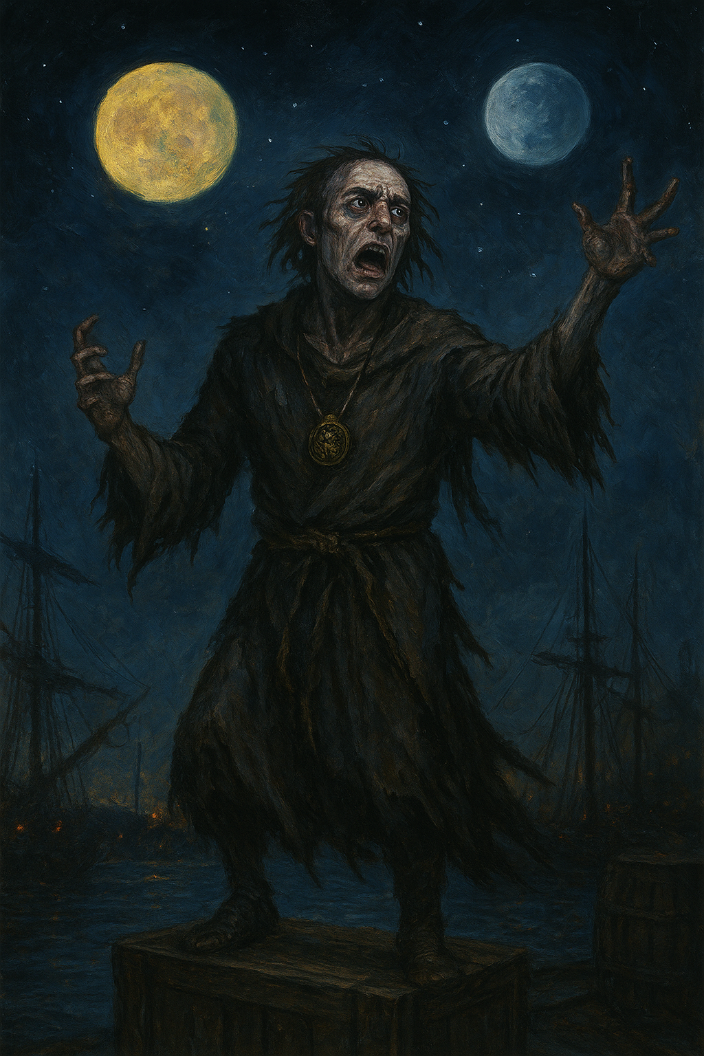 The smell of brine and pitch mixes with the stench of fish guts. Dockhands shout, gulls cry, and amidst the din — a voice cuts through, ragged but powerful.