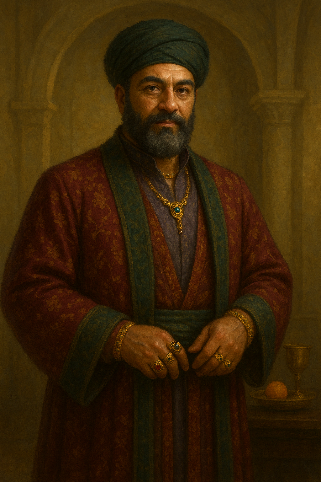 - Smells perpetually of cardamom, saffron, and rosewater — scents imported through his own trade lines.