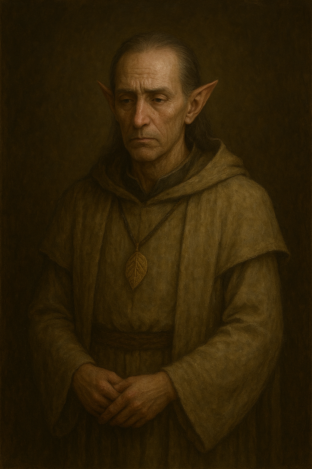 Selanor has silver-grey hair that falls loose around his shoulders, often bound with green cord when he tends the temple. His skin is pale with a faint golden undertone, his eyes a striking shade of verdant green that seem to hold both weariness and quiet fire. His robes, though plain since his confinement, are still well-kept, dyed in muted greens and browns, with embroidery of vines and blooming flowers at the hems.