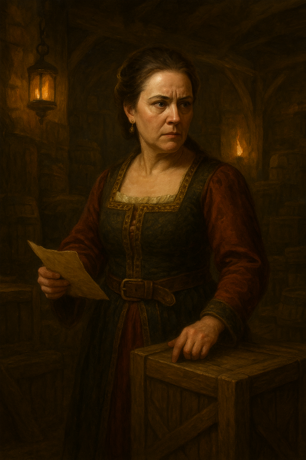Signora Lucietta Santo is a woman of motion — always doing, always seeing to. Where her husband, Signore Santo, is the public face of their mercantile house, Lucietta is its pulse: the one who makes things move when words have finished. She has spent decades in the warehouses and counting rooms of Pullitierra, learning the rhythms of trade like a second language.