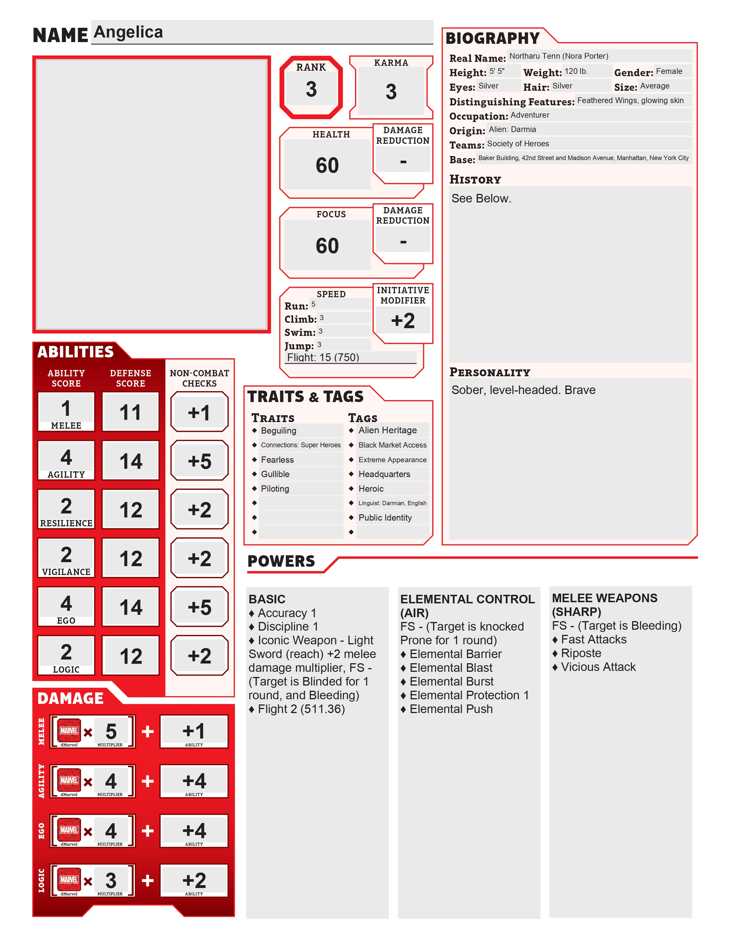 Angelica, (Northaru Tenn), Comes from an outpost of her people, the Darmia, located in the Angel Nebula (NGC 2170), some 2,707 light years from Earth. She grew up in this colony and often helped out in her parents store.