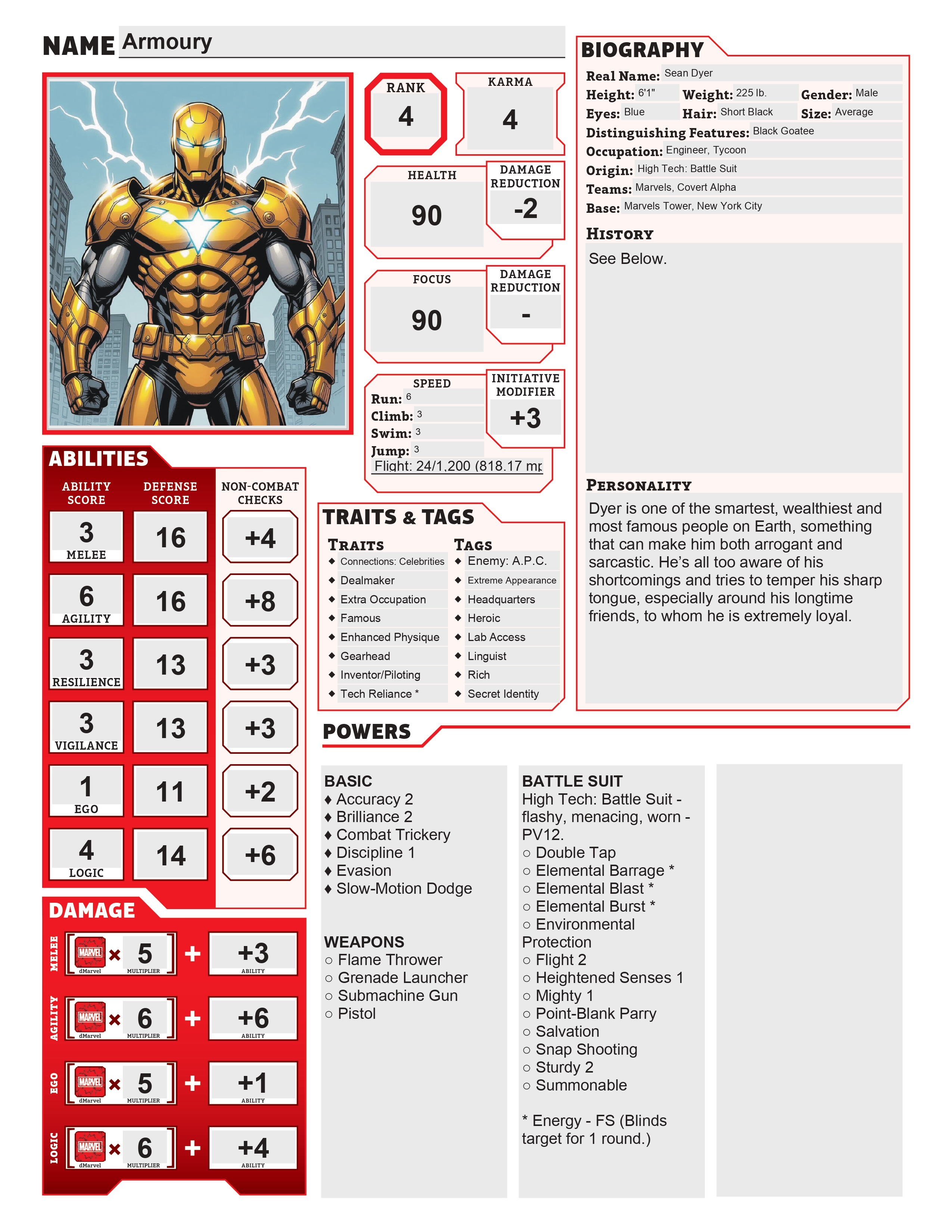 Since those first days Dyer has improved the design, materials, and technology of his power cell and the battle armour, and founded the super heroic group the Marvels, who reside at Marvel Mansion, New York City. He has also realized that the CFC's are slowly killing him but that the armour is slowing that process, he is now looking for a cure so he can permanently remove his battle suit.