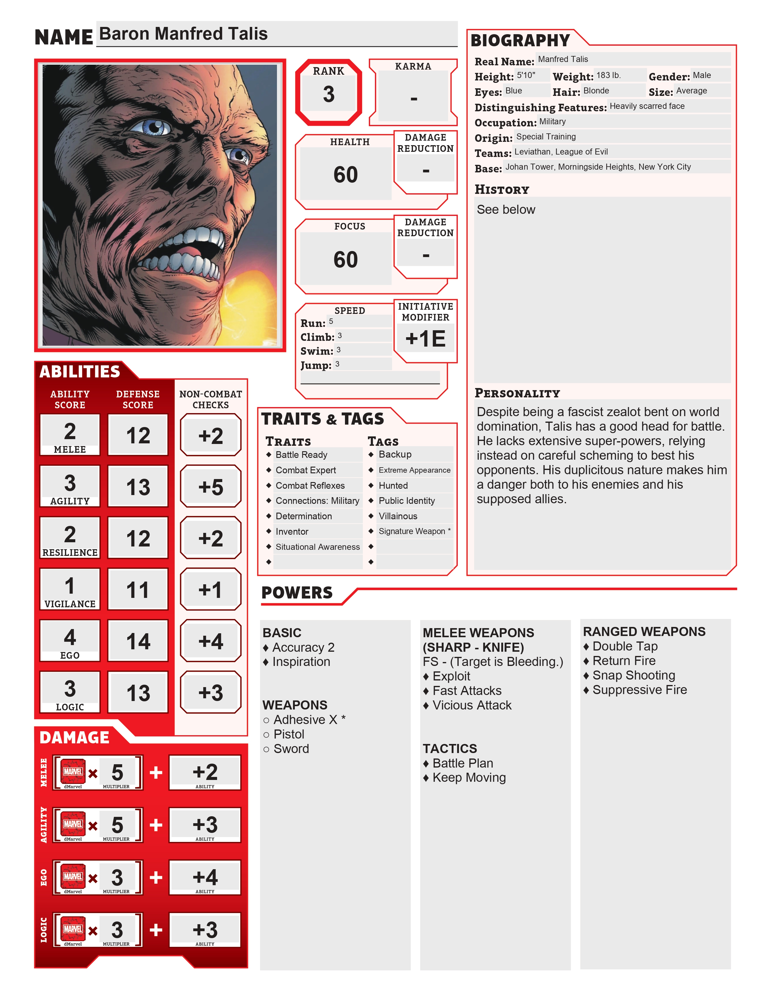 Manfred has long served as a key figure among fascist organizations, acting as an ally to the likes of Totenkopf and as leader of Leviathan. Over the years, he’s personally founded and led a number of super-teams, including multiple incarnations of the League of Evil and the Phenomes.