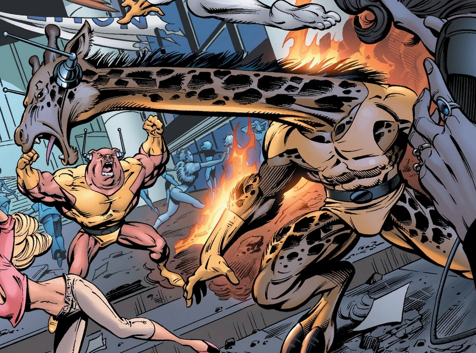 The Giraffe Battle Suit was originally invented by the Engineers at E.S.P. Technologies , who designed this battle suit and others around the powers and the look of animals. It is made from a tough, durable, lightweight, more protective form of Kevlar, and is also fitted with a communication array.