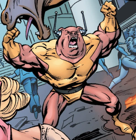 The Pig Battle Suit was originally invented by the Engineers at E.S.P. Technologies , who designed this battle suit and others around the powers and the look of animals. It is made from a tough, durable, lightweight, more protective form of Kevlar, and is also fitted with a communication array.