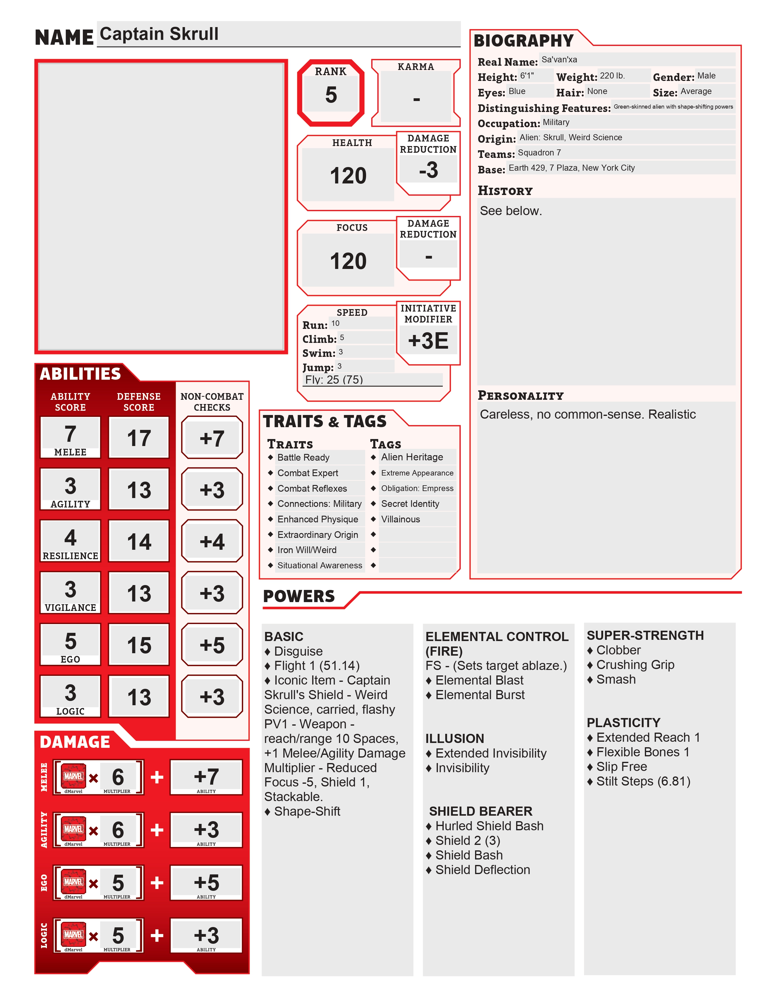 However, before the program passed beyond its first test, Galactus devoured their homeworld, in the process killing nearly the entire Skrull race and leaving a few survivors scattered across space. Sa'van'xa, one of only a handful of surviving Super-Skrulls, began looking for fellow survivors. He headed to Earth after hearing accounts of UFOs and aliens that may have a lead to his people. Upon arriving, his ship was badly damaged and he was stranded on this god-forsaken hole.