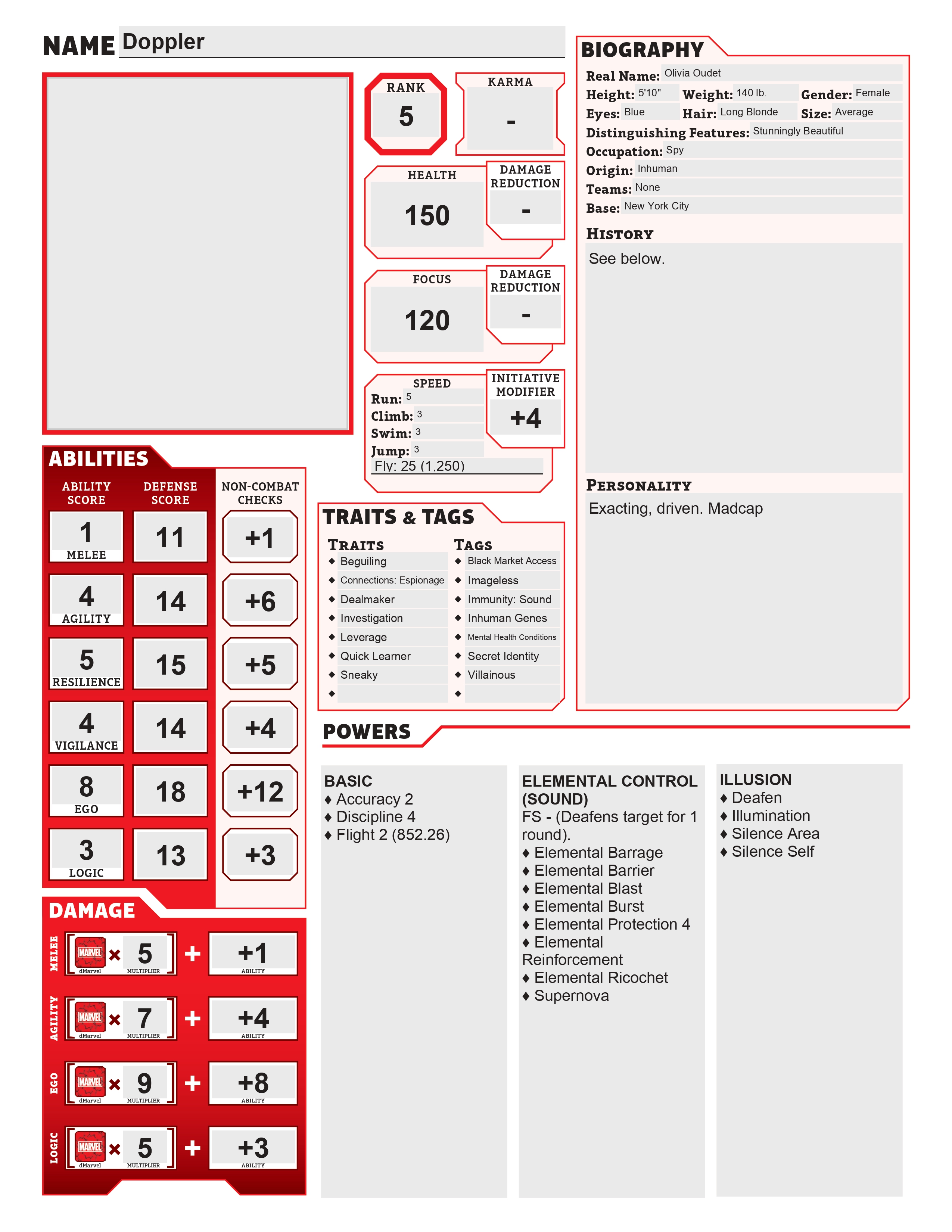 Olivia is one of the most beautiful women who has ever lived. Her power dictates that she remain invisible and silent while conscious, her beauty is only ever seen when she is unconscious or asleep. As such she has developed a hatred of normal couples and uses her sound attacks to hurt others. She is as cruel on the inside as she is beautiful on the out.