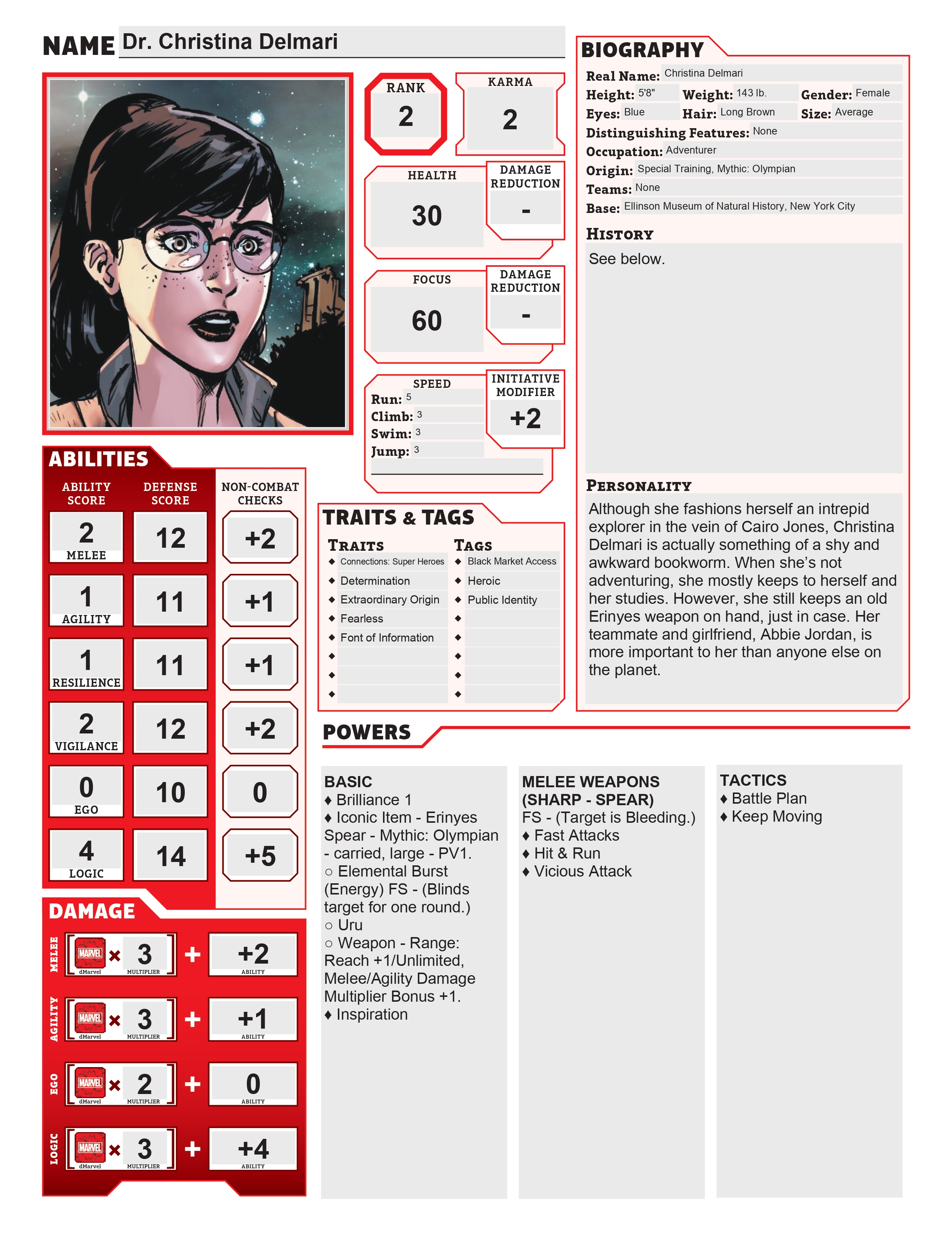 The two eventually managed to end those vile plans, but not before Delmari was fatally wounded. As a reward for Delmari’s heroic efforts, Erinyes (Diana Karras) merged her essence with that of the fallen archaeologist. Now Erinyes could transform into Delmari at will—and vice versa—but the pair could never exist in the same space. While one of them adventured in the real world, the other was forced to reside in a pocket dimension.