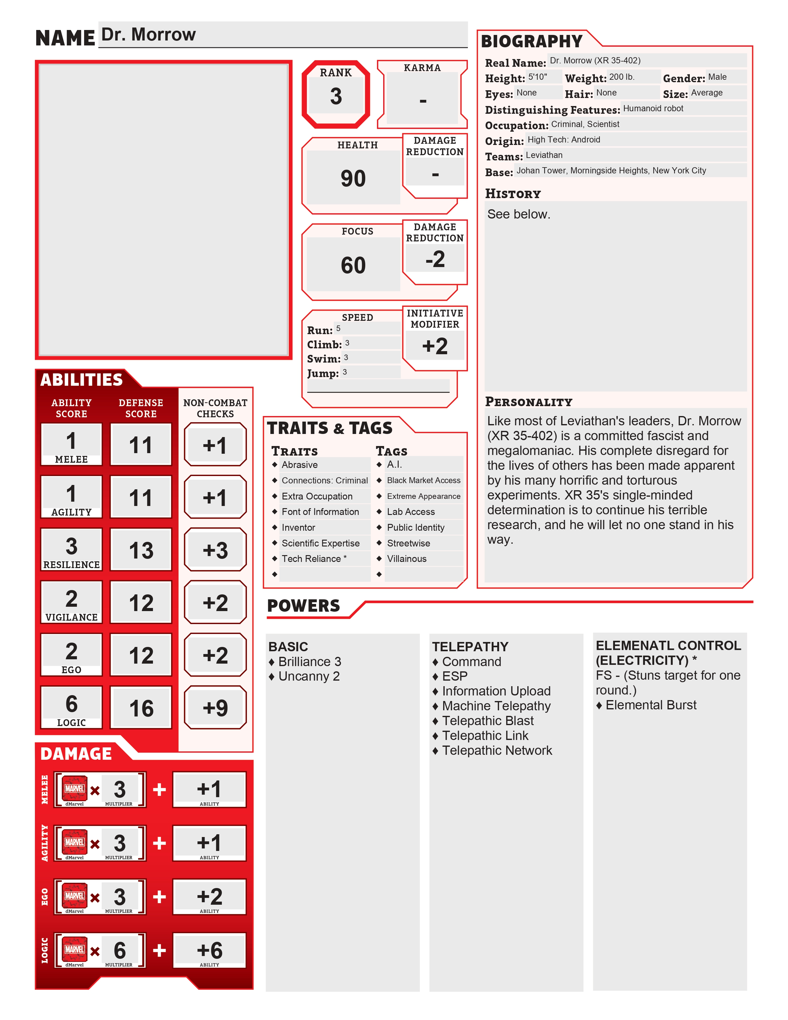 In the years since, Morrow has always been a top-ranking member of Leviathan High Command. He forms the backbone of the evil organization’s scientific efforts, and has been personally responsible for the creation of many of their most powerful villains. Dragonfly, Turbulence, Fallout, Arson, and Therapos all owe their existence to the dastardly inventions of Morrow.