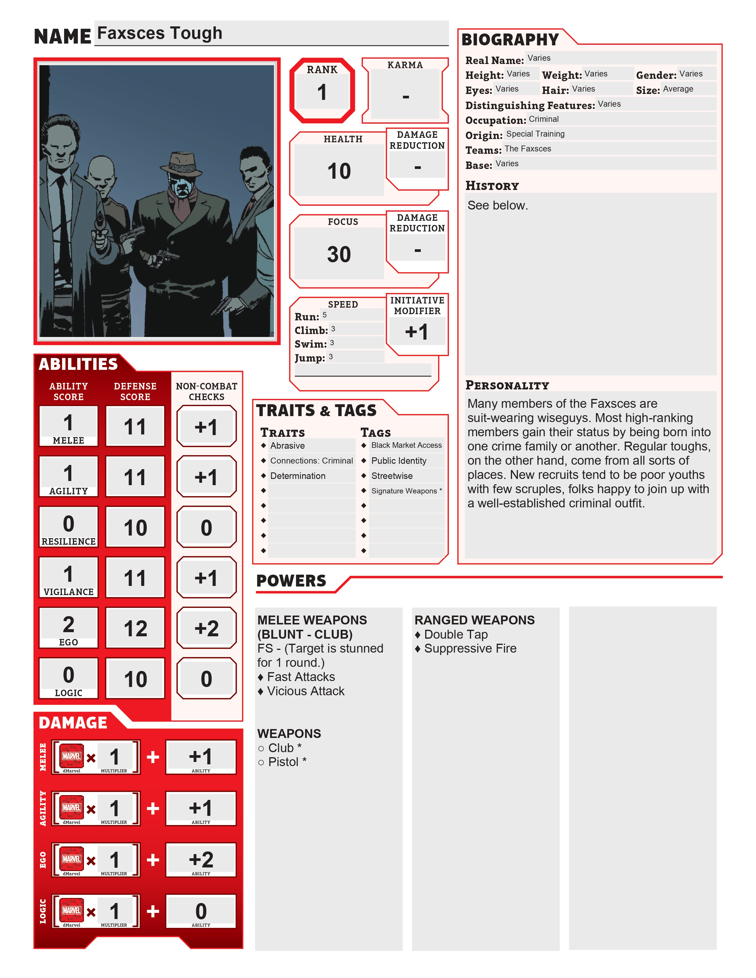 Unlike Leviathan or other fanatical criminal organizations, Faxsces toughs are motivated primarily by profit, not political ideology. Their pursuit of money often leads them to commit heinous crimes and even bankroll super villains, but they can be persuaded down more righteous paths—for the right price.
