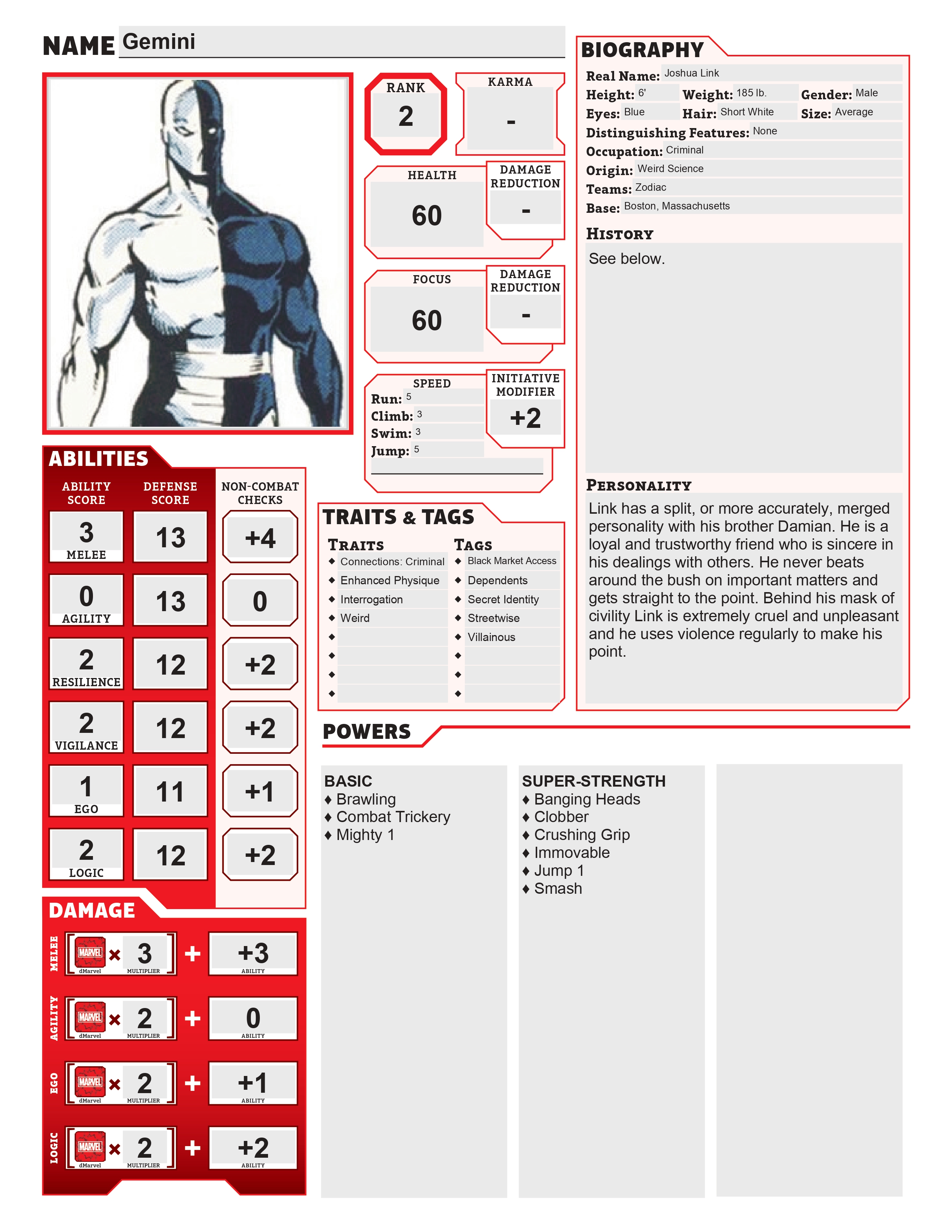 Joshua Link was a career criminal who possessed a powerful psychic connection to his twin brother, Damian. When both brothers were caught in a freak accident involving an experimental machine mutating their bodies and minds, Joshua developed the ability to link minds with Damian, allowing them to merge into a powerful composite being known as Gemini. However, while Damian remained a moral and composed individual, Joshua was violent and aggressive. Over time, Joshua's personality gained dominance whenever they combined, influencing Gemini's actions toward criminal activity.