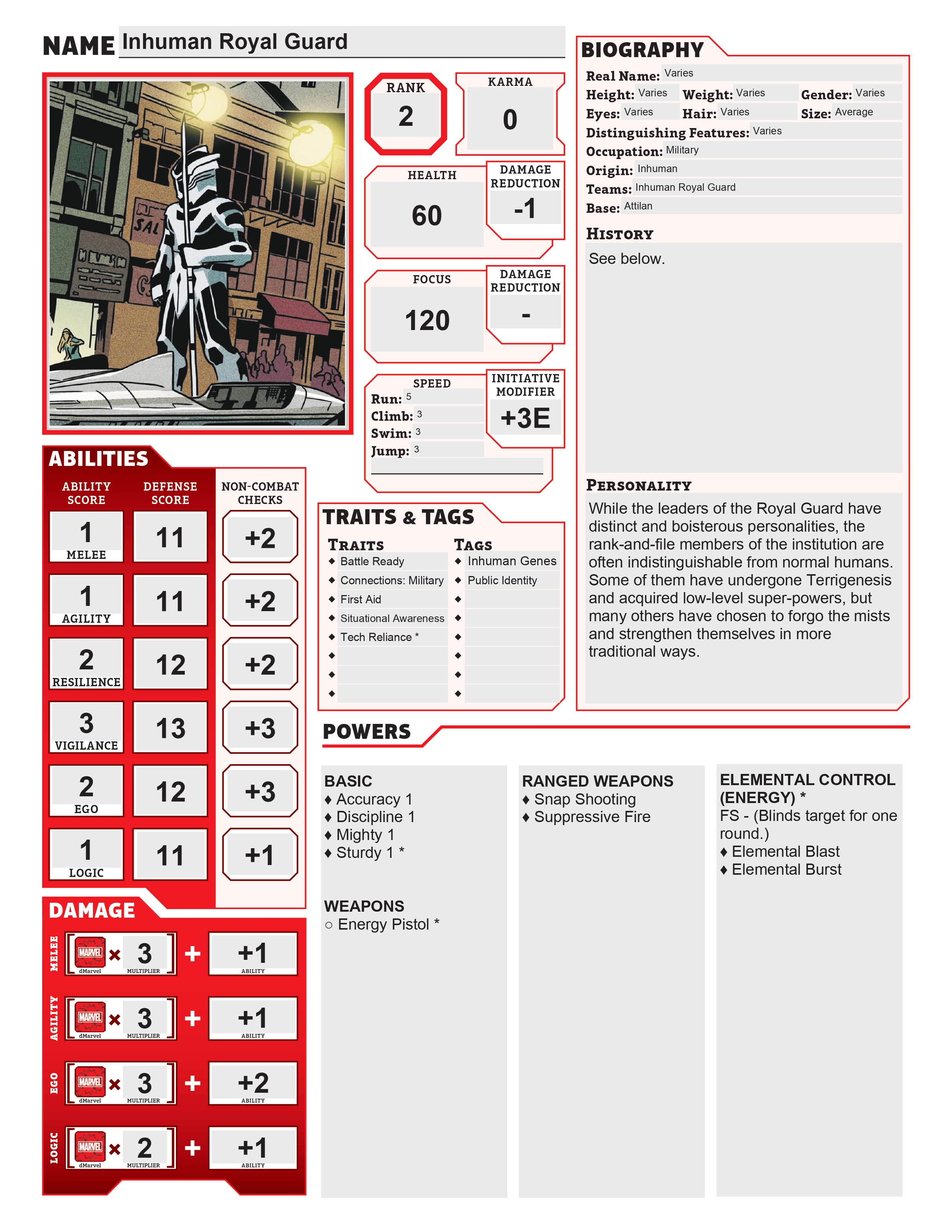The Inhuman Royal Guard has existed in one form or another since the dawn of the Inhuman monarchy itself. For thousands of years, they have been charged with the protection and preservation of the Royal Family. It is a duty that most of its members treat with deadly importance.