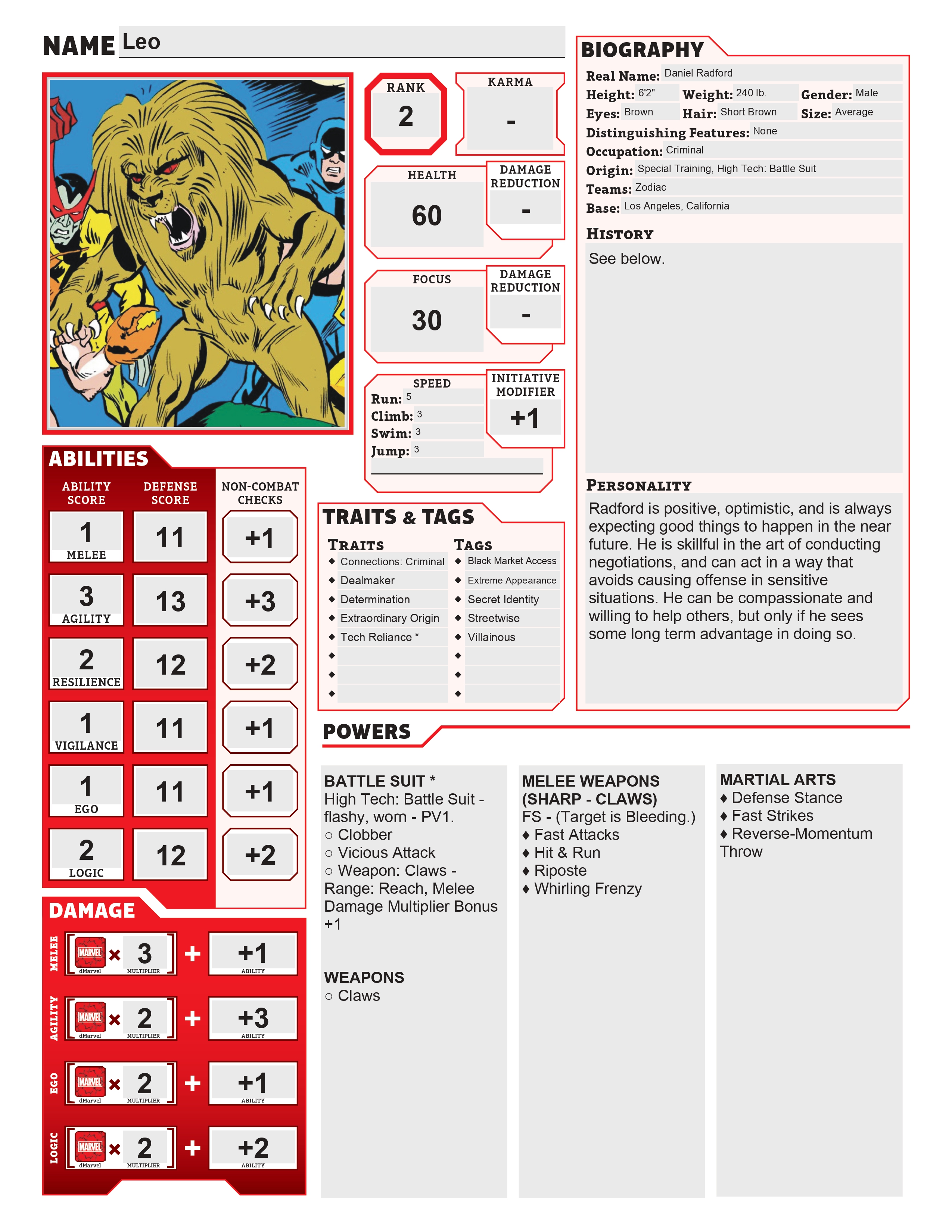 Daniel Radford is a founding member of the Zodiac, and his base of operations was Los Angeles, California. The Zodiac Cartel was founded by Taurus (Cornelius van Lunt), handpicking the eleven other members; van Lunt concealed his own identity, while he was the only one who knew the identities of the others. Each member was based in a different American city as part of his nationwide criminal network, with the ultimate goal of world economic and political domination.