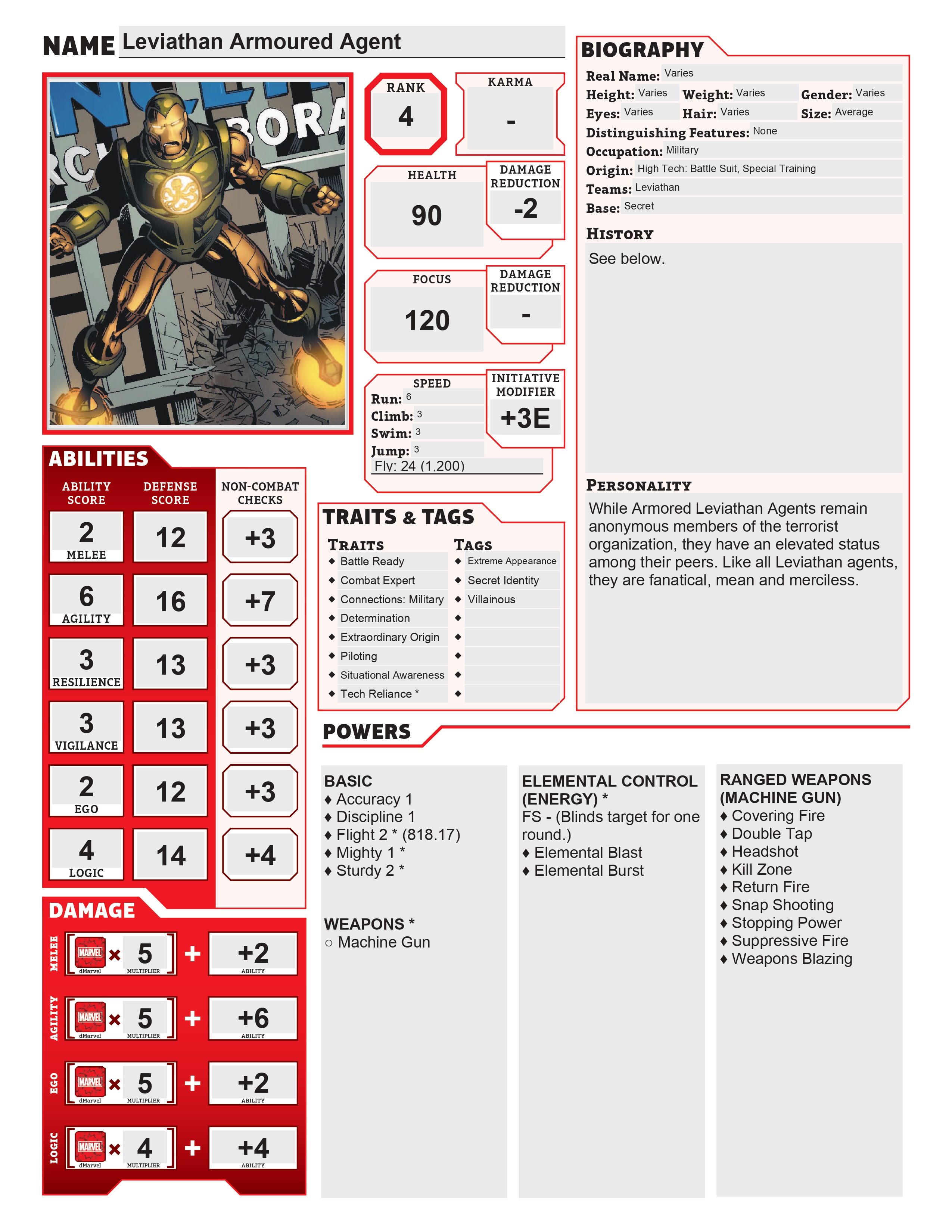 As a terrorist organization, Leviathan uses most of its many recruits (Leviathan Mercenary) as cannon fodder. But sometimes, Leviathan will spend the resources upgrading an agent to be their tank on the battlefield. Leviathan reverse-engineers the technology of heroes and villains, like Armoury, Iron-Agent, A.P.C., Charged and others, to create their own specialized armour. While this new armour may not be as dependable as those superbeings, it can still create a shock troop who can carry out the heaviest Leviathan missions.