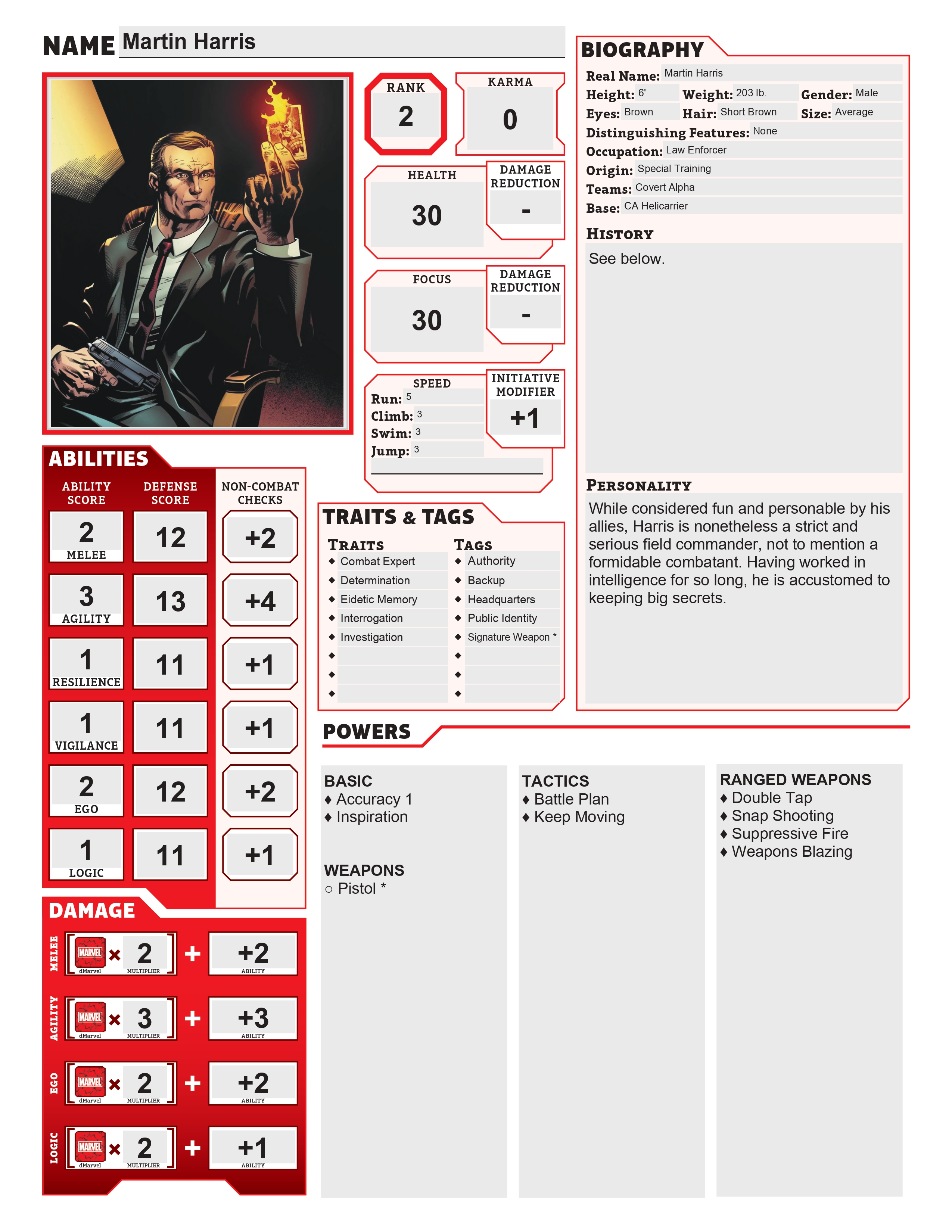 As a young adult, Harris joined the U.S. Army Rangers, where he fought alongside an equally young Erica Grant. After their time in the service, both friends decided to join up with Covert Alpha. Harris’ leadership skills quickly earned him the rank of Special Ops Supreme Commander.
