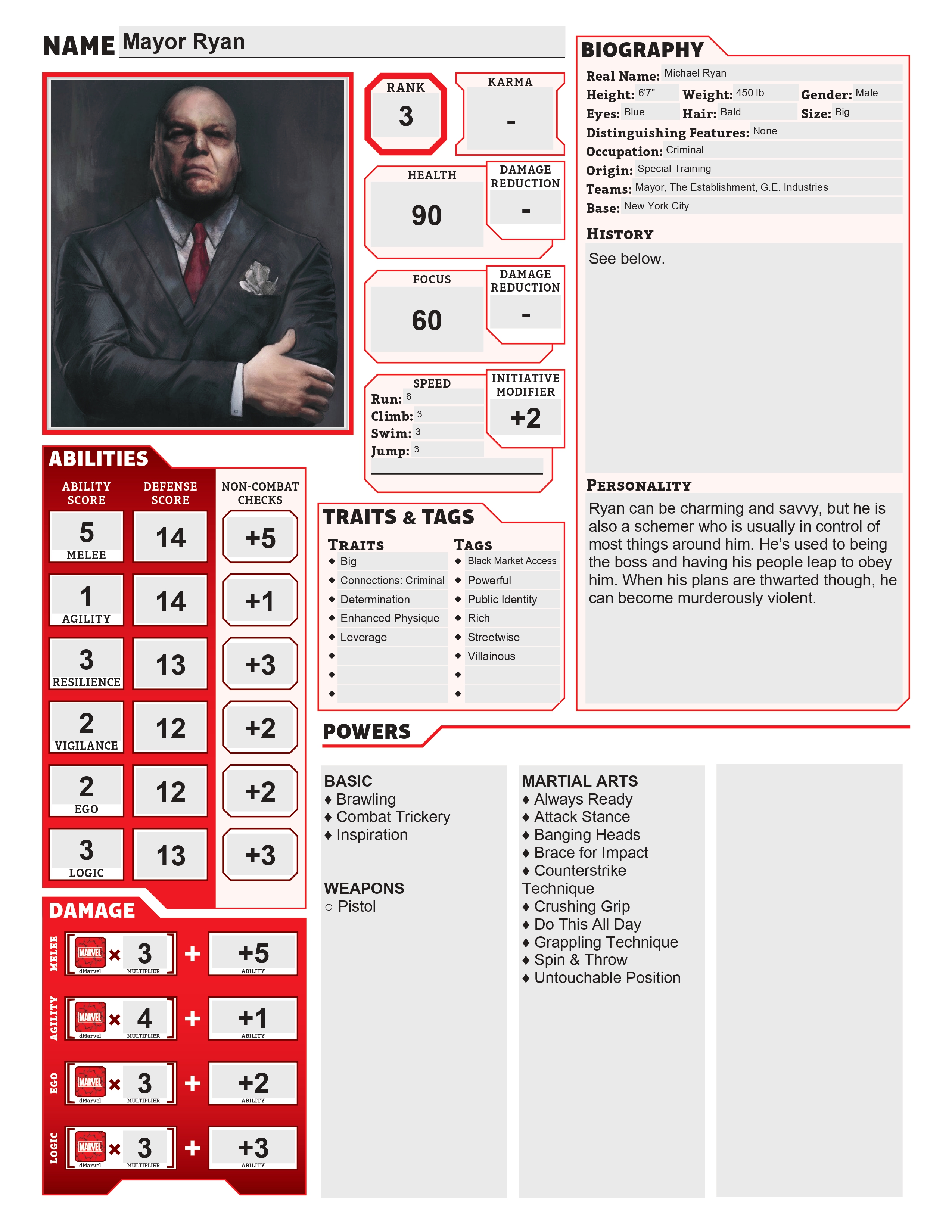 Ryan recently became the mayor of New York City after helping save the city during an alien invasion. He has since divested himself of his criminal enterprises—but not his crooked ways.