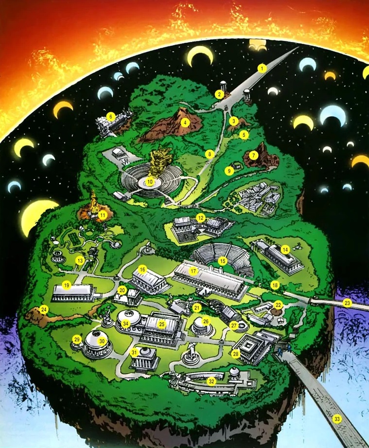 Olympus serves as the home to the Olympian gods. Olympus resembles the Asgard (Realm), although it is no bigger than a large city. This relatively flat asteroid-like landmass is suspended in space, and is surrounded by what its inhabitants call “the Abyss.” It is not known if Olympus's source of light and heat is Earth's sun, or a glowing ball of light dissimilar to a star in most of its properties. Unlike Earth, where the force of gravitation radiates from the mass of the planet, Olympus has gravity, which apparently radiates from some point or object beneath the suspended landmass. Consequently, there is a topside to Olympus, upon which beings can stand.