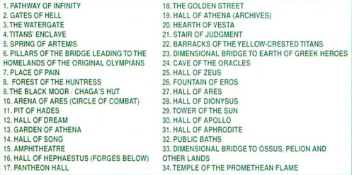 Among the major buildings of Olympus are the great halls of the principal Olympian gods and the Pantheon Hall, where the Olympian high council meet. Those Titans not confined to the land of the dead live in an enclave amid the large forest governed by Diana. Wrongdoers are punished at the "Place of Pain".
