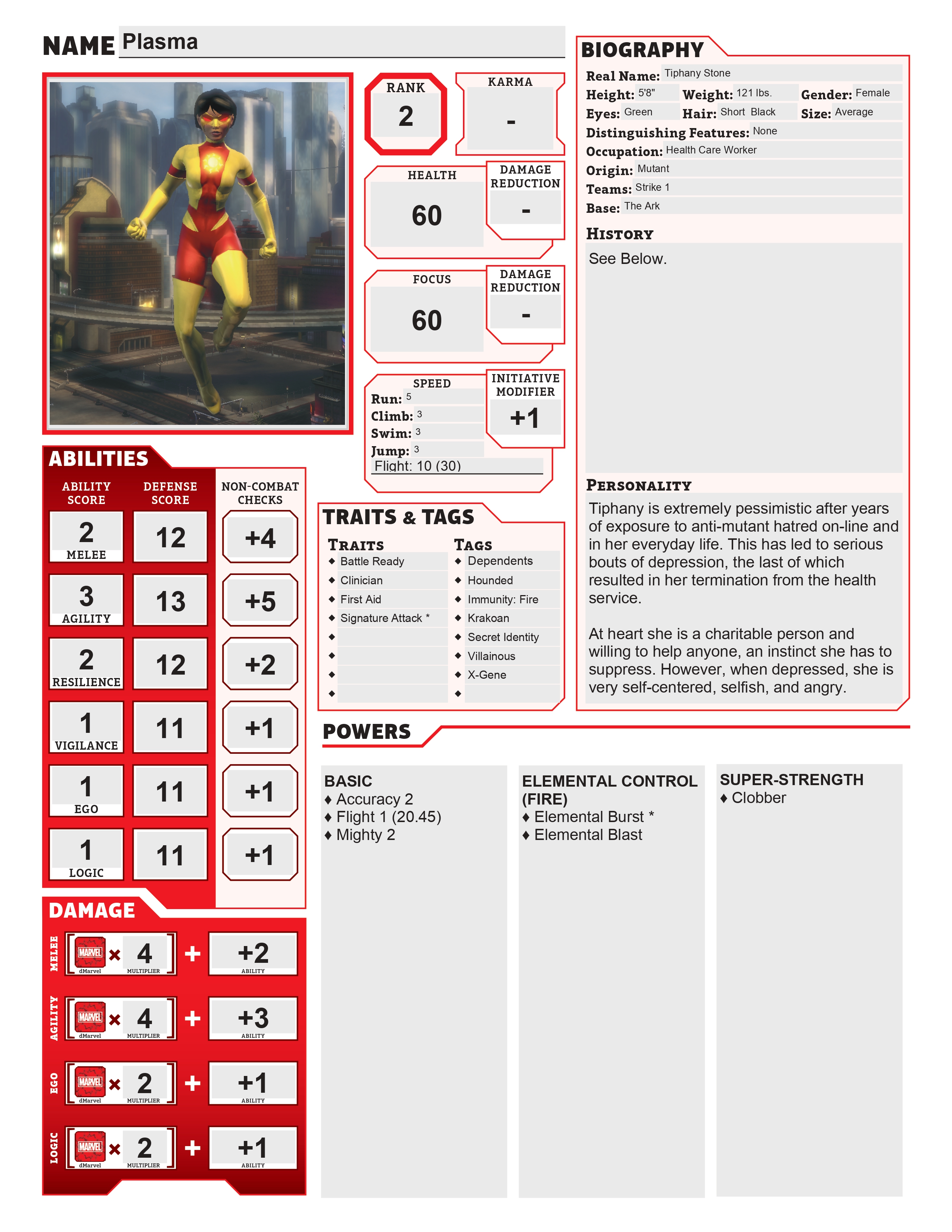 Tiphany's power manifested during puberty. By the age of 13 she knew she was a mutant and that she could produce heat and fire and was immensely strong for her age. As an adult she became a nurse but her mental health led to her dismissal.