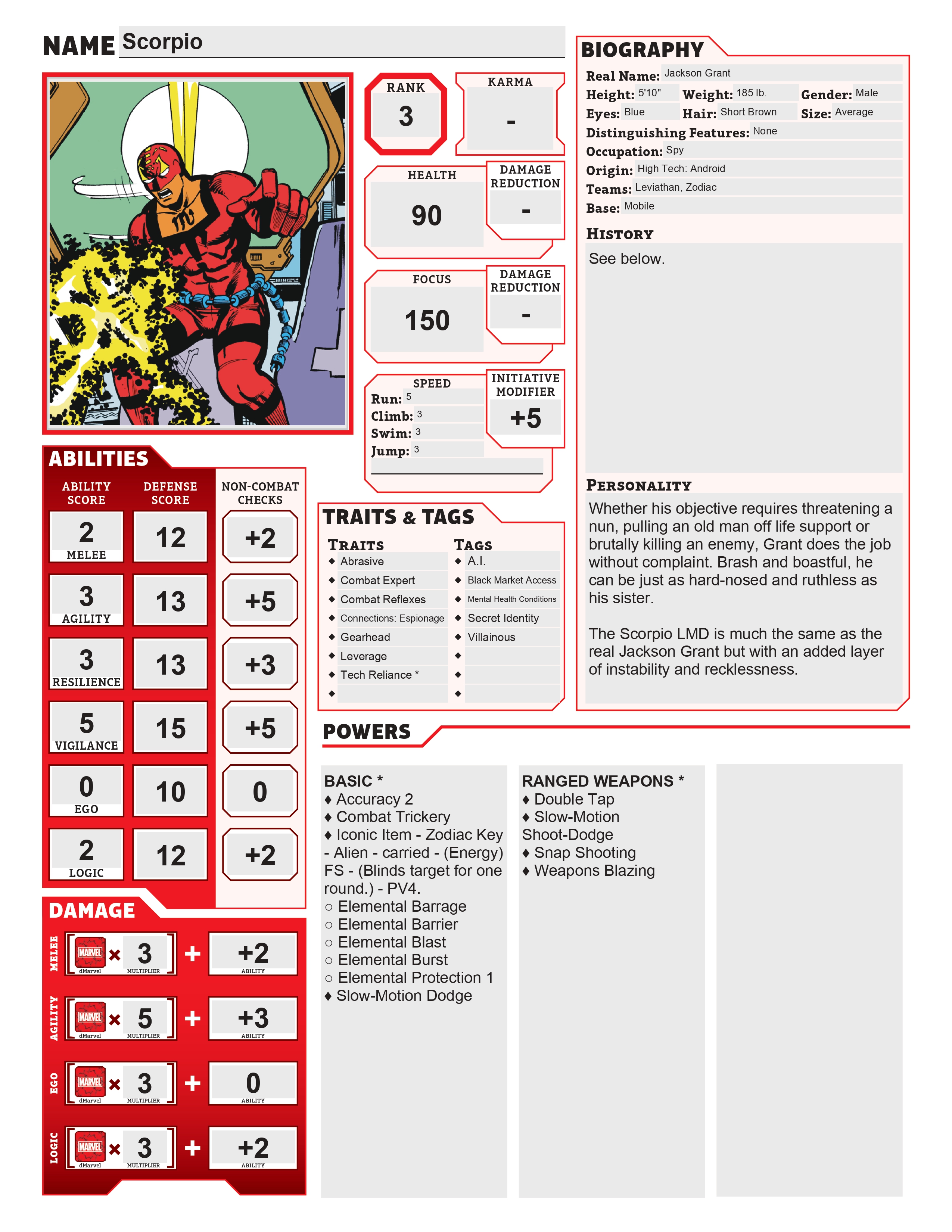 Unfortunately, Jackson’s LMD was not a perfect copy. The LMD grew to hate the brothers and society at large and sought to destroy both. Using a weapon called the Zodiac Key and backed by a super-villain team modelled after the original Zodiac, the LMD launched several failed campaigns against his sister under the codename Scorpio, before eventually killing himself.