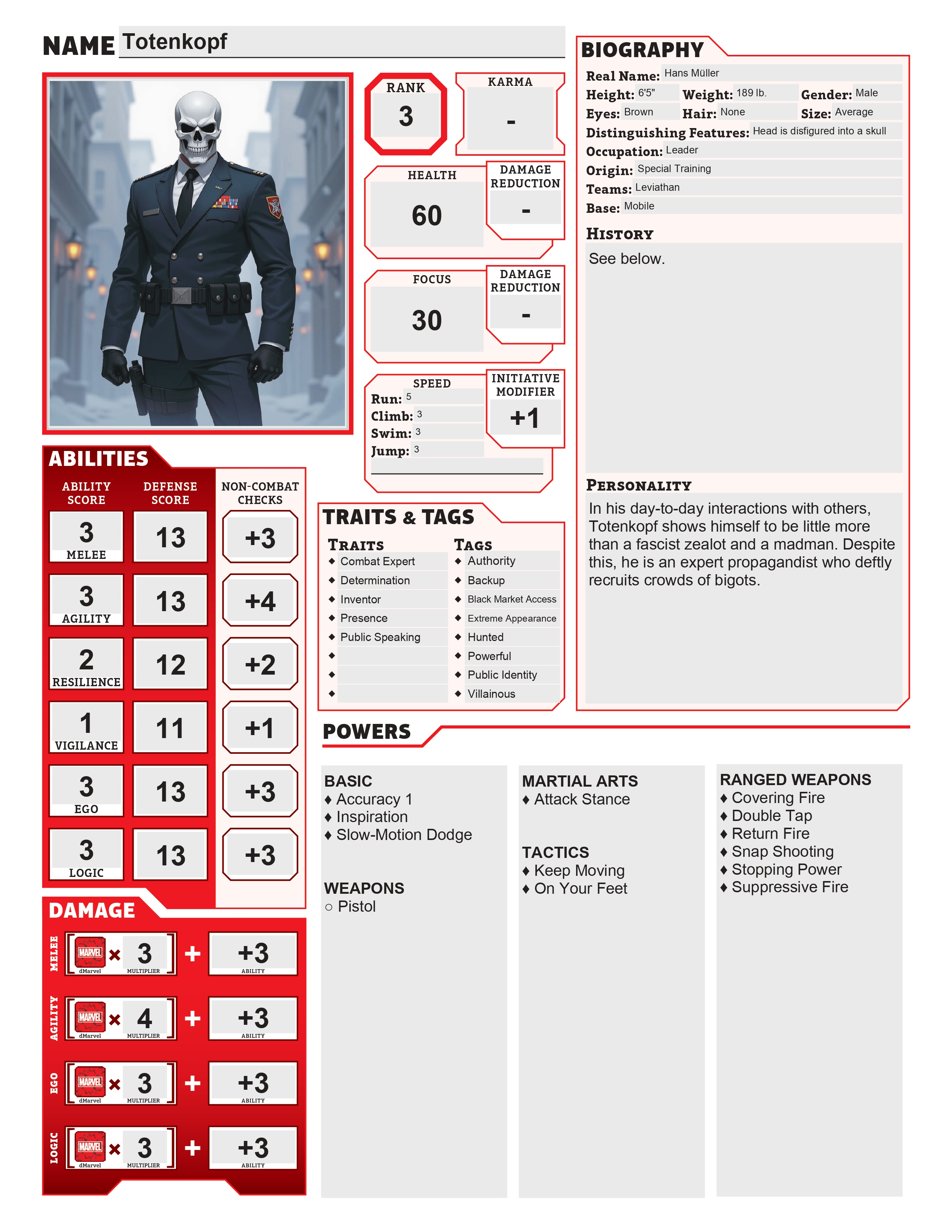 After World War II, the skull-faced Müller carried the mad führer’s dream of a worldwide Nazi government into the modern age. Were he not so dangerous, it would be easy to write him off as a cackling madman. A regular ally or even commander of fascist organizations like Leviathan, he’s capable of launching complex schemes that threaten to bring the entire planet beneath his heel.