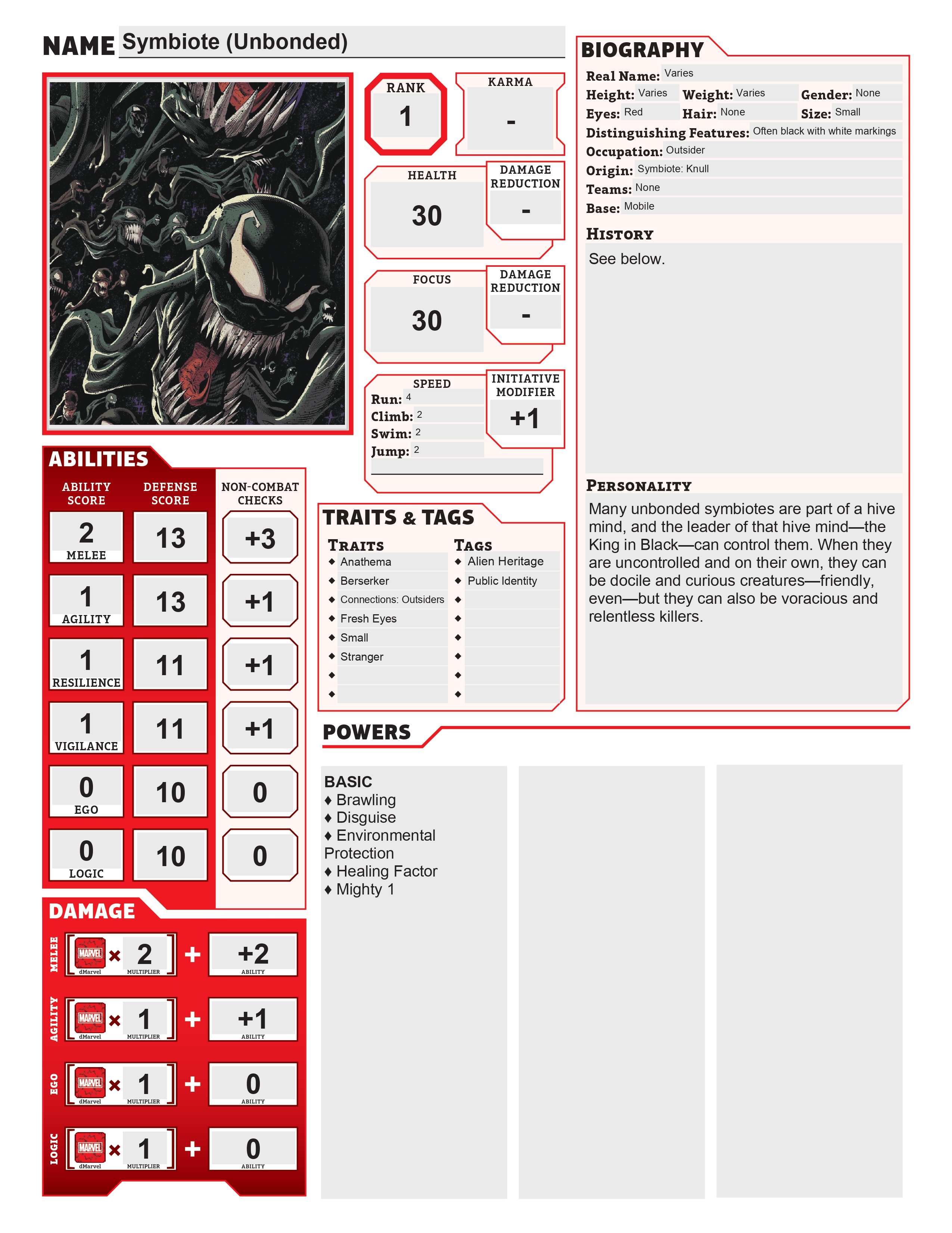 Symbiotes are sometimes encountered without any hosts. This profile represents unbonded symbiotes from the planet Klyntar.