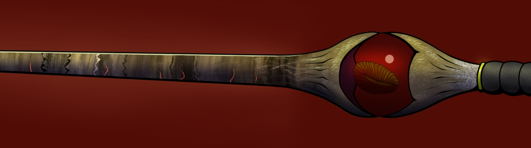 The final component of the sword is the hollow jewel in the center – a red polished zircon containing an enclosure housing water and the only still extant specimen of Dickinsonia Costata. The zircon itself is the oldest piece of Earth at 4.4 billion years old, and hence carries the strongest known anti-demonic repelling power of any known material in the Rodinians' possession. Contained within is something far more special however; an enigmatic pre-Cambrian creature that sits near the very base of Bilateria – or all animals with symmetric body plans. It predates fish, arthropods (including arachnids and insects), reptiles, and mammals and is a distant ancestor to them. This one is sometimes colloquially known as the Sire of Rodinians, but there's a great deal of dispute over whether it's literally everyone's ancestor. Saint Okur the Chrononaut, one of the Saint's Sovereign and founder of the Guild of Time Streamers, claimed to have personally obtained it from the late Ediacaran Period oceans 566 million years ago. She also claimed that it's offspring continue onwards to diversify, leading into the Cambrian explosion to form the basis of all major animal clades.
