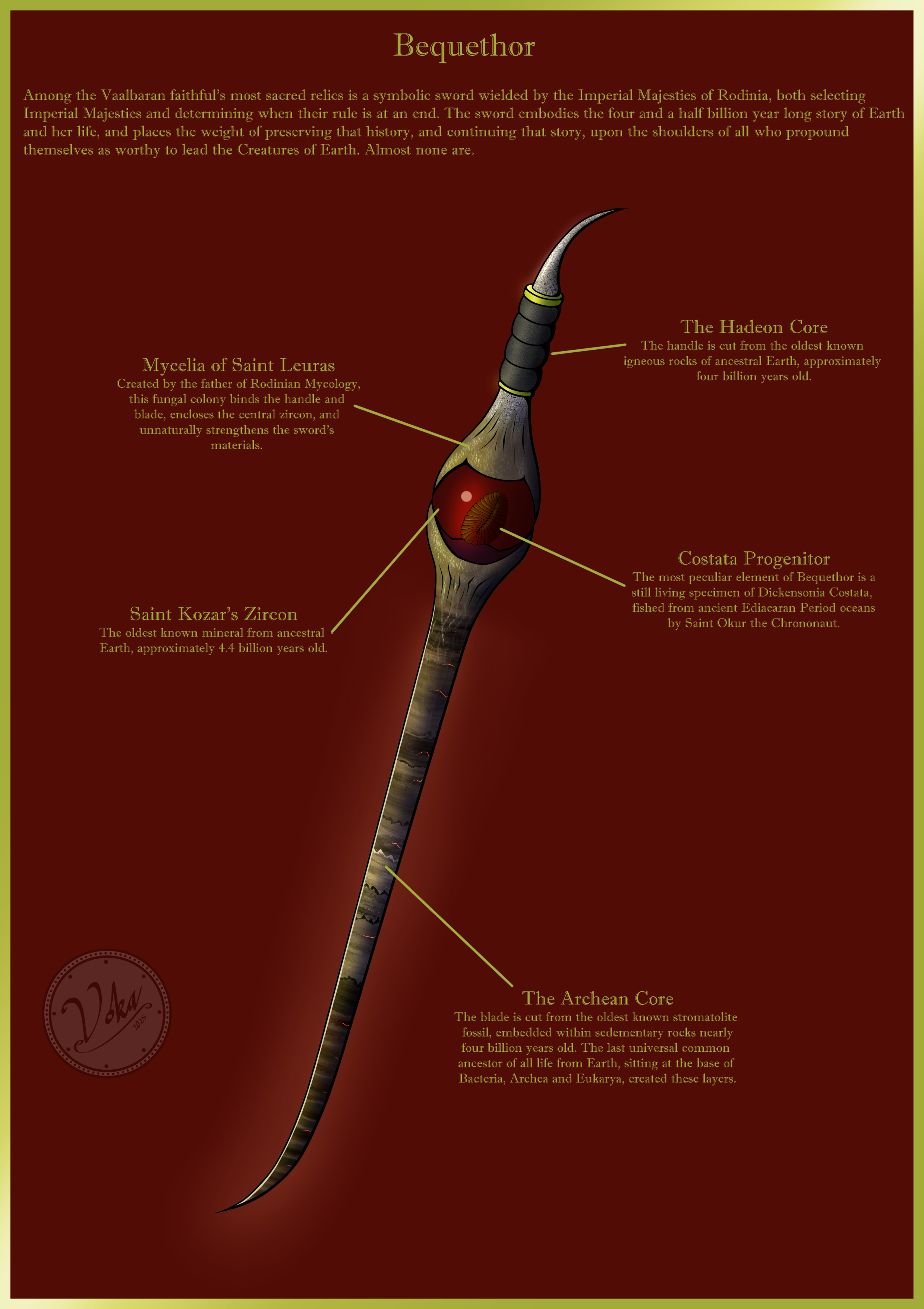 The Rodinians of the Vaalbaran faith, revering this sword as one of their most sacred artifacts, therefore create and give themselves the purpose of remembering this history, thereby recognizing the existence of all those creatures, sapient or not, before them. They make it their purpose to respect them by preserving and enhancing the tree of life that exists today. Otherwise, to allow this history to be forgotten, such as through the extinction of all Earth life, would be to succumb to utter nihilism and invite an act of natural vandalism. It's therefore central to their beliefs for this history to continue, ensuring there're those who can continue to remember it; to ensure the tree of life continues to grow. Bequethor is one of the strongest symbols of that purpose as it's passed from Imperial Majesty to Imperial Majesty.